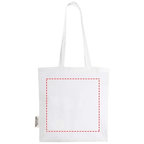 La tote bag Madras realizzata in cotone riciclato certificato 100% GRS è la borsa perfetta da regalare durante un evento, una conferenza oppure da utilizzare come borsa per la spesa. La densità del cotone di 140 g/m² rende questa borsa robusta, resistente e adatta per trasportare oggetti pesanti nello scomparto principale. Grazie ai manici lunghi 30 cm, questa tote bag è facile da trasportare. Anche i metodi di stampa disponibili per questa tote bag sono certificati GRS, assicurando che l'intera catena di fornitura sia trasparente e certificata. Realizzata in India. Resistenza fino a 5kg di peso.