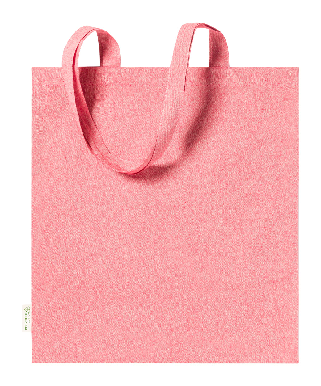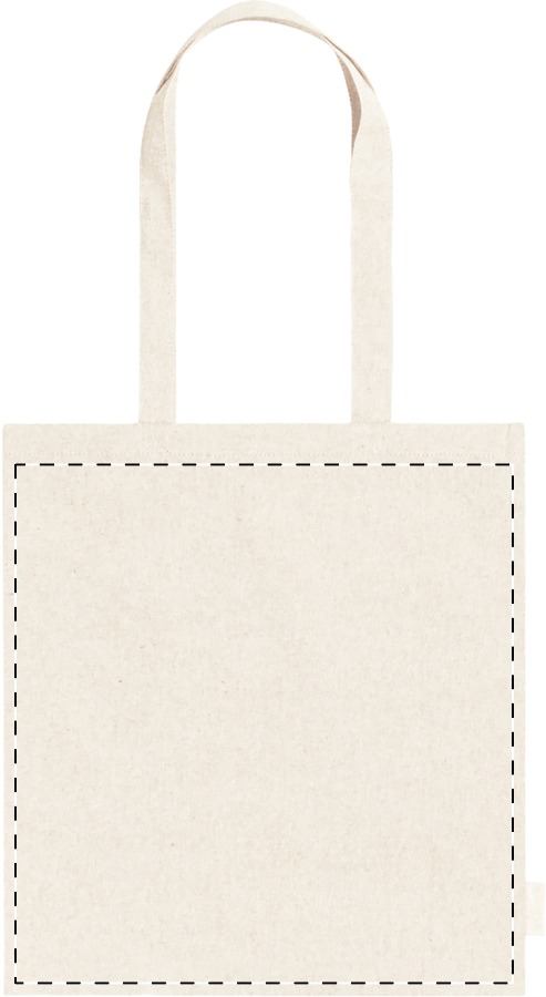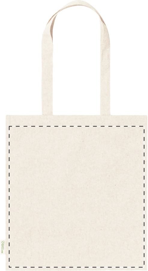 Borsa riutilizzabile in 100% cotone riciclato da 140 g/m² con manici lunghi ed etichetta cotone riciclato.