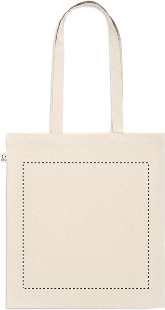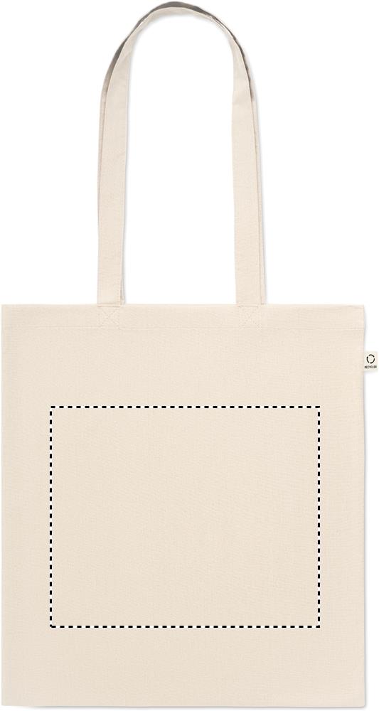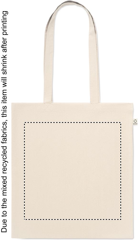 Questa shopping bag in cotone riciclato post-consumo si compone del 70% di cotone riciclato e del 30% di RPET, con manici lunghi. 140 gr/m². Questo articolo può restringersi leggermente dopo la stampa per il tipo di materiale con cui è stata realizzata. Personalizzabile con stampa a colori sia sul fronte che sul retro. Carica o inviaci il tuo logo, e riceverai un'anteprima di stampa gratuita, non vincolante ai fini dell'acquisto.