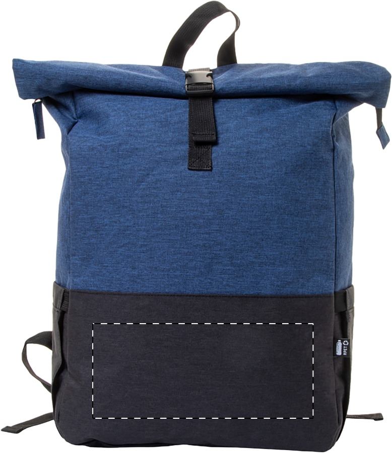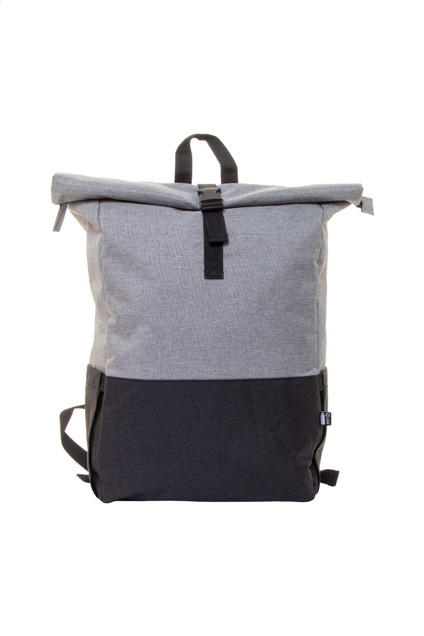 Zaino rolltop bicolore in RPET con fibbia di chiusura, scomparto principale con zip, scomparto imbottito per laptop (15") e tablet (10"), tasche laterali, schienale e spallacci imbottiti. Poliestere RPET 300D ed etichetta RPET.