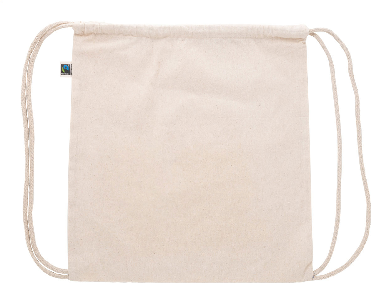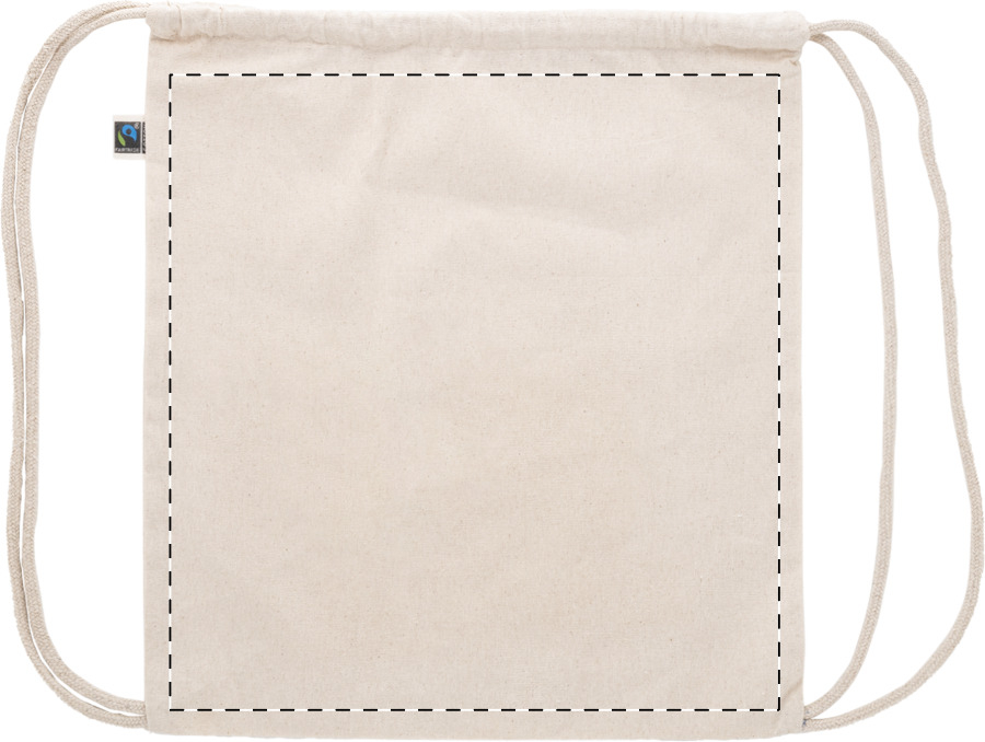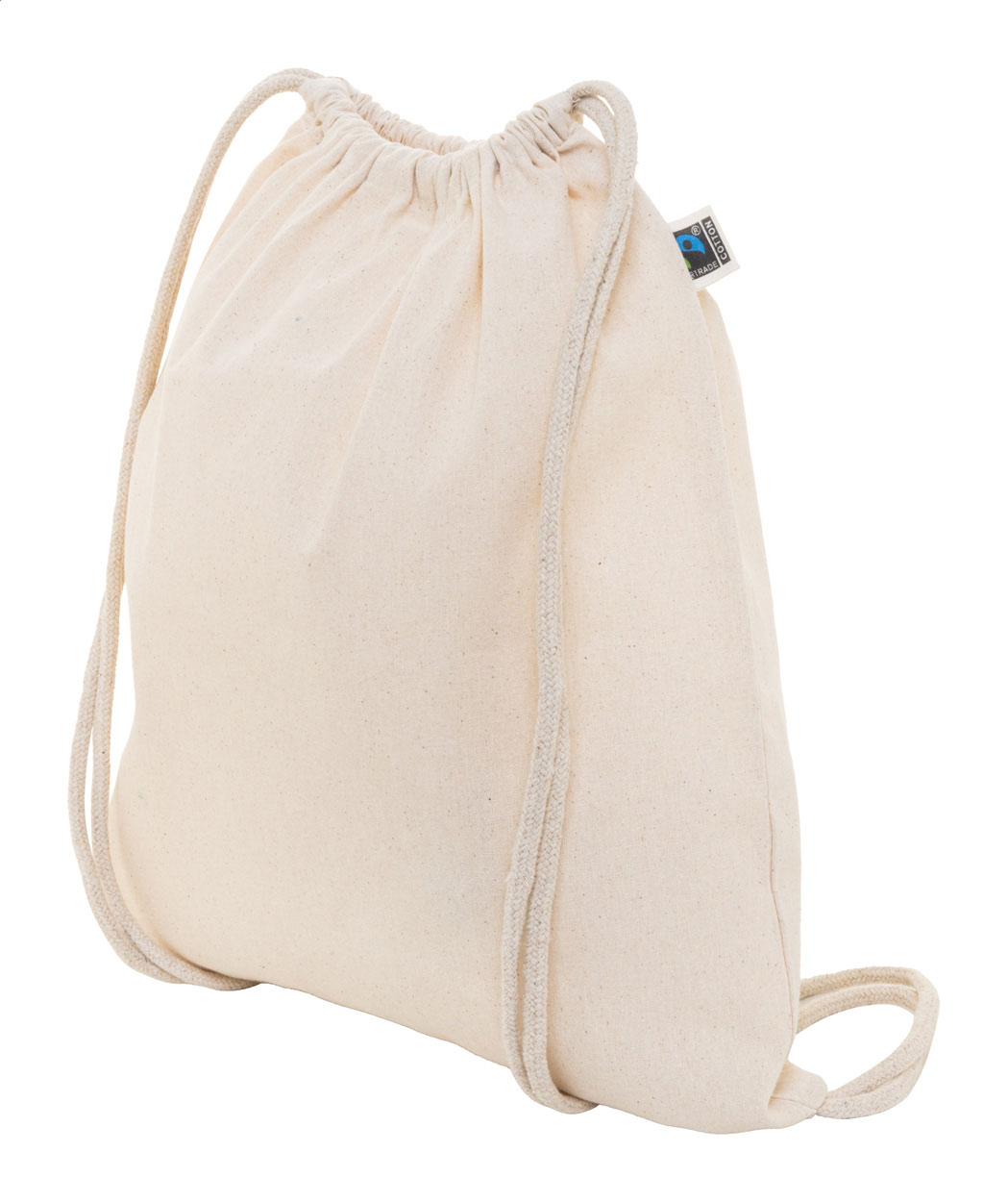Sacca in 100% cotone equosolidale da 180 g/m² con chiusura a coulisse ed etichetta Fairtrade.