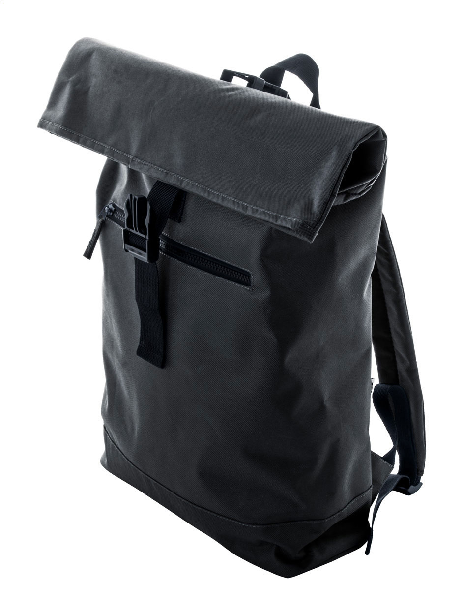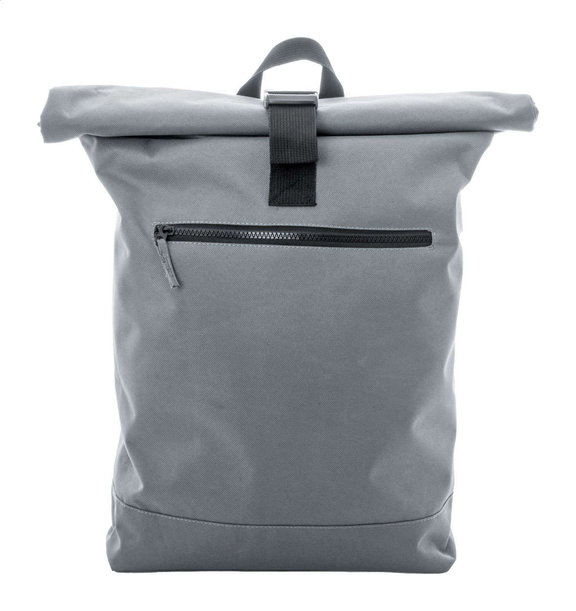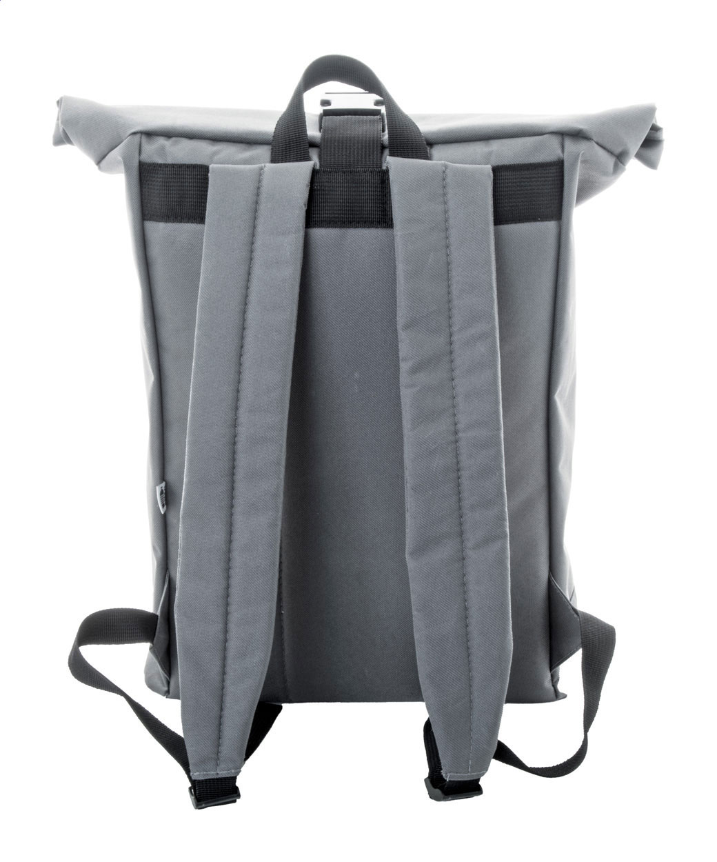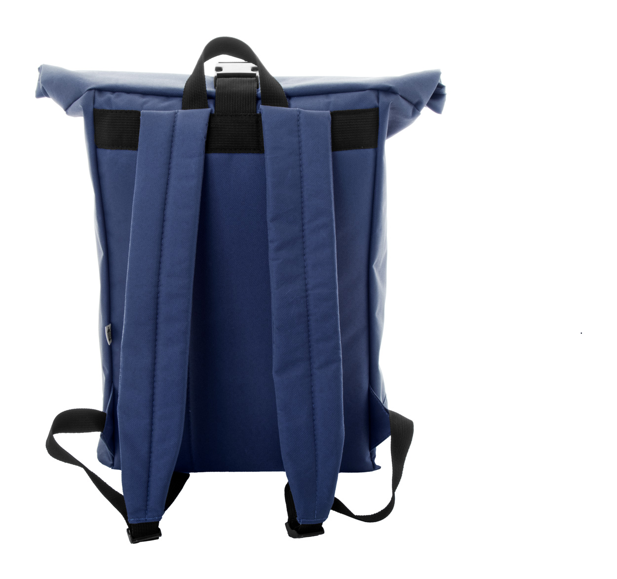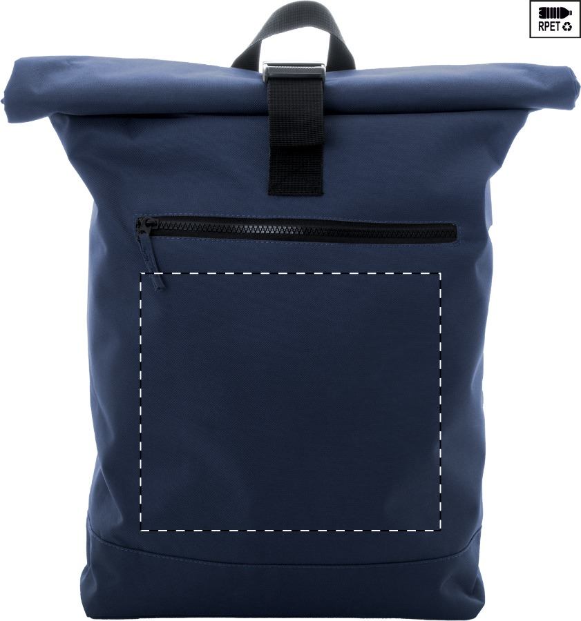 Zaino in poliestere 600D RPET con chiusura avvolgibile completa di fibbia, tasca frontale con cerniera, scomparto imbottito per laptop (15"), schienale e spallacci imbottiti ed etichetta RPET.