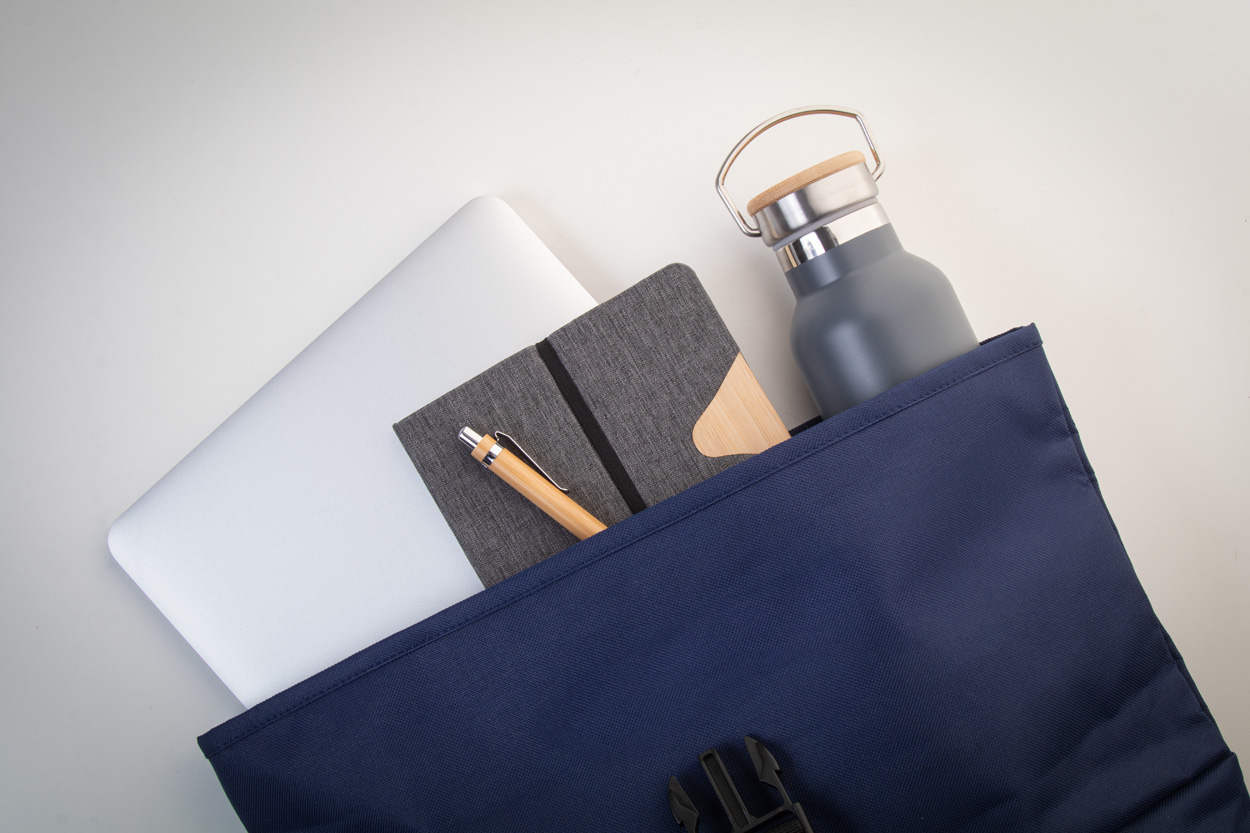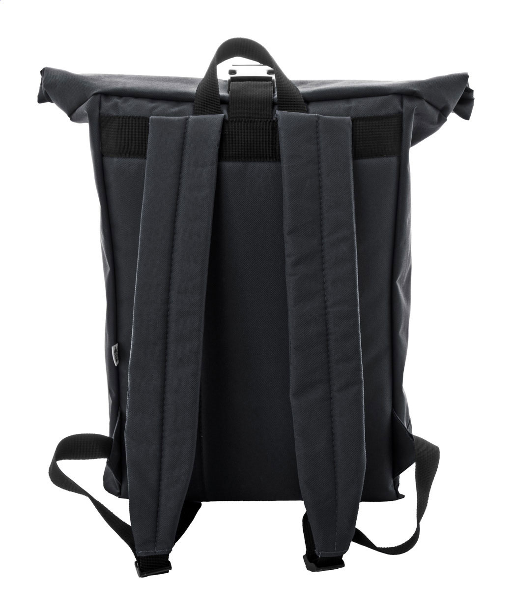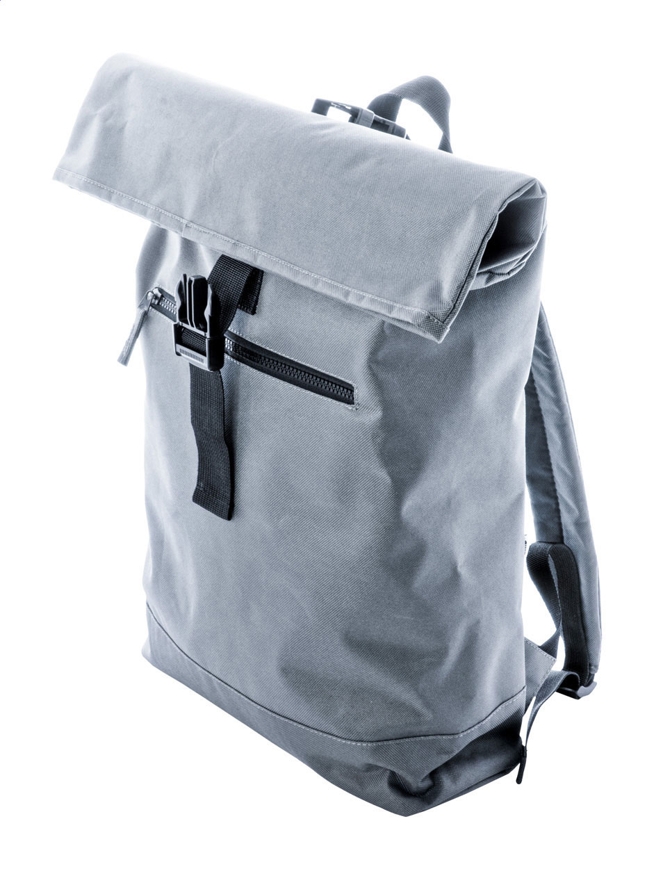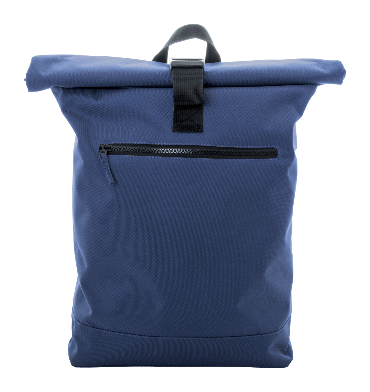 Zaino in poliestere 600D RPET con chiusura avvolgibile completa di fibbia, tasca frontale con cerniera, scomparto imbottito per laptop (15"), schienale e spallacci imbottiti ed etichetta RPET.