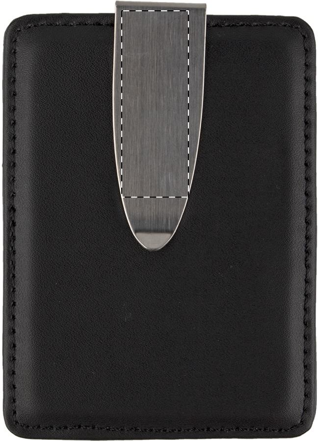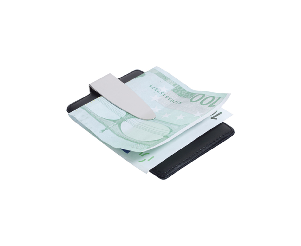 Porta carte di credito in pelle PU con uno slot per carte di credito e ferma soldi in metallo.