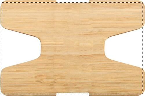 Portacarte in compensato di bambù con cinturino in gomma elastica.