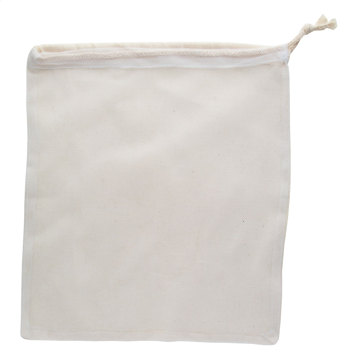 Sacchetto riutilizzabile in cotone con fronte in rete di poliestere e chiusura con coulisse, 95 g/m².