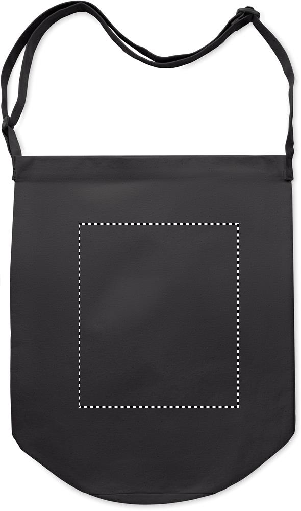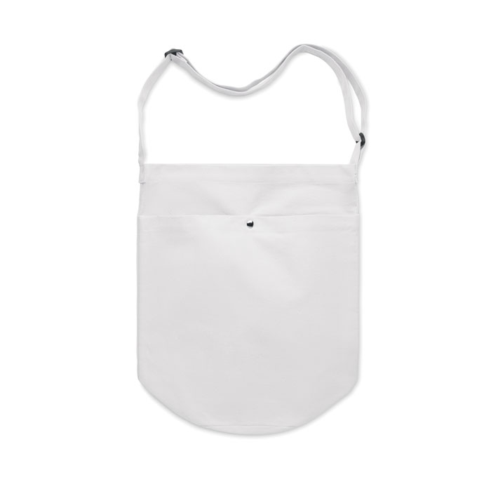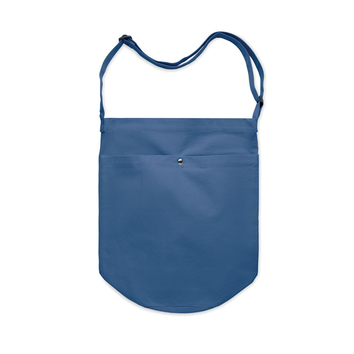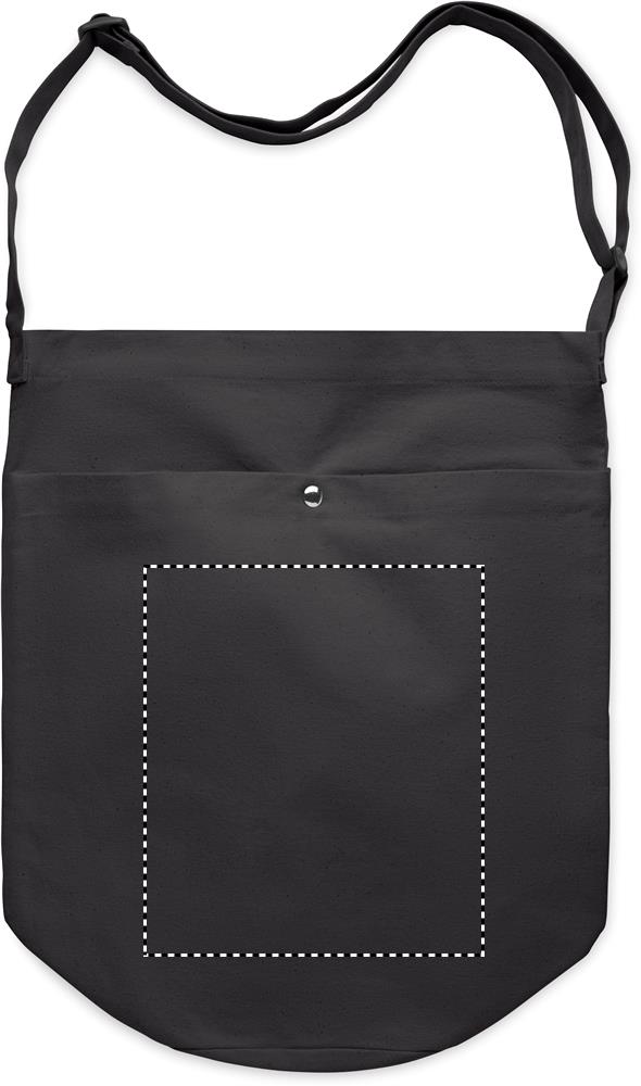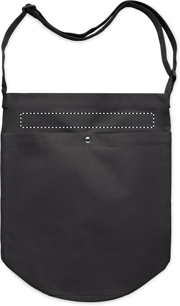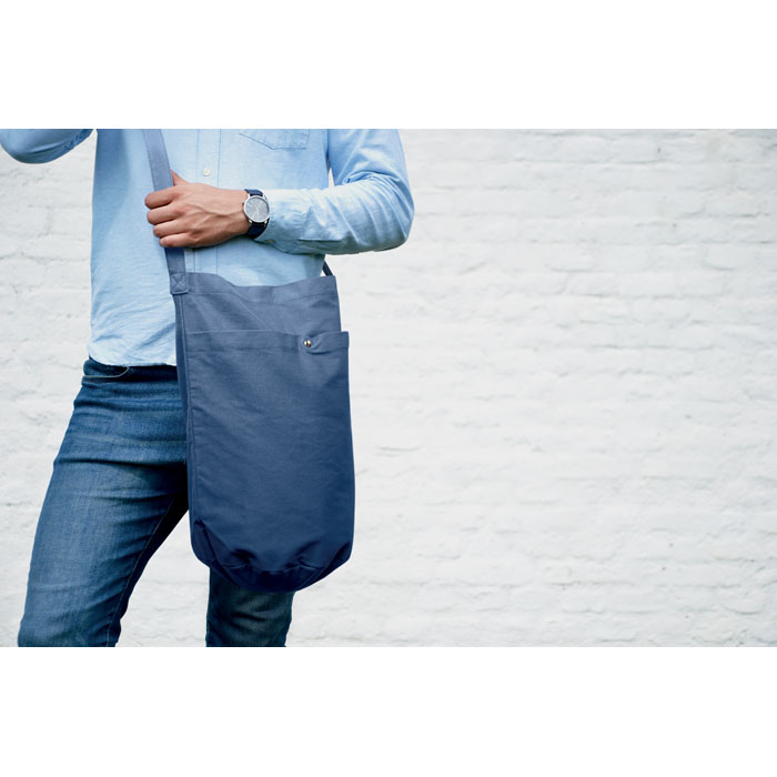 Shopper in tela con lunga tracolla regolabile e ampia tasca frontale con chiusura a scatto. Include una tasca interna. 270 gr/m².