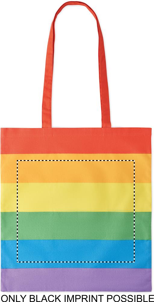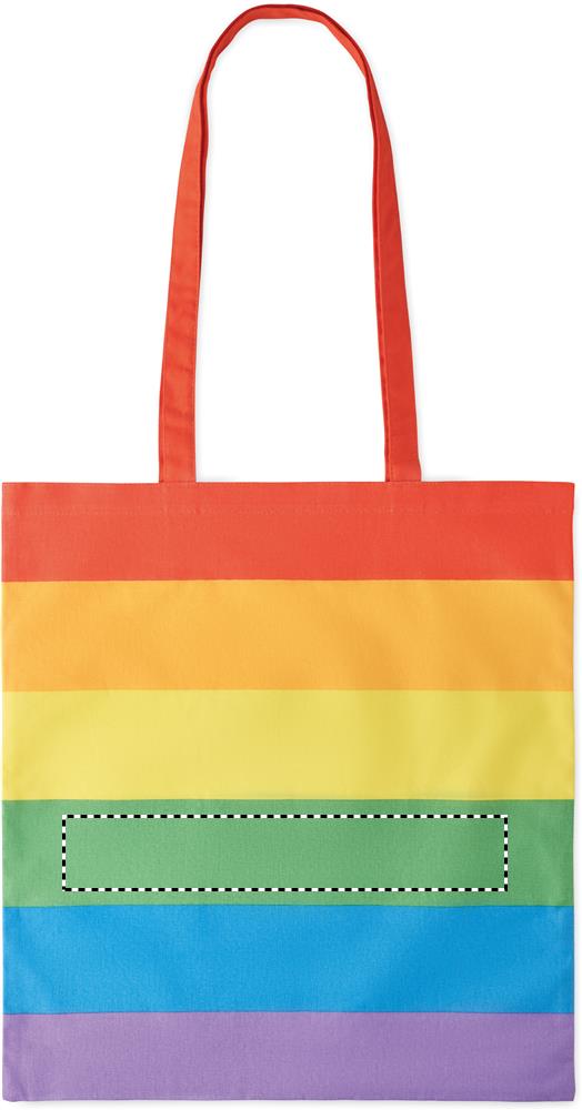 Shopper in cotone arcobaleno con manici lunghi. 200 gr/m². Aggiungete un po' di colore al marchio o a un messaggio speciale con questa allegra tote bag. Peso limite di trasporto 2.5kgs. Questo prodotto è certificato OEKO-TEX® STANDARD 100. Può essere personalizzata con stampa a colori, oppure con stampa ad un solo colore. Carica o inviaci il tuo logo e riceverai una bozza grafica gratis non vincolante ai fini dell'ordine.