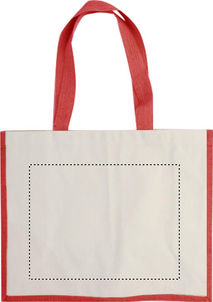 Shopper con soffietti in juta con interno laminato, fronte e retro in canvas e manici piatti in cotone. Può essere personalizzata con la stampa a colori sia sul fronte che sul retro della borsa. Carica o inviaci il tuo logo e riceverai una bozza grafica gratuita non vincolante ai fini dell'ordine.