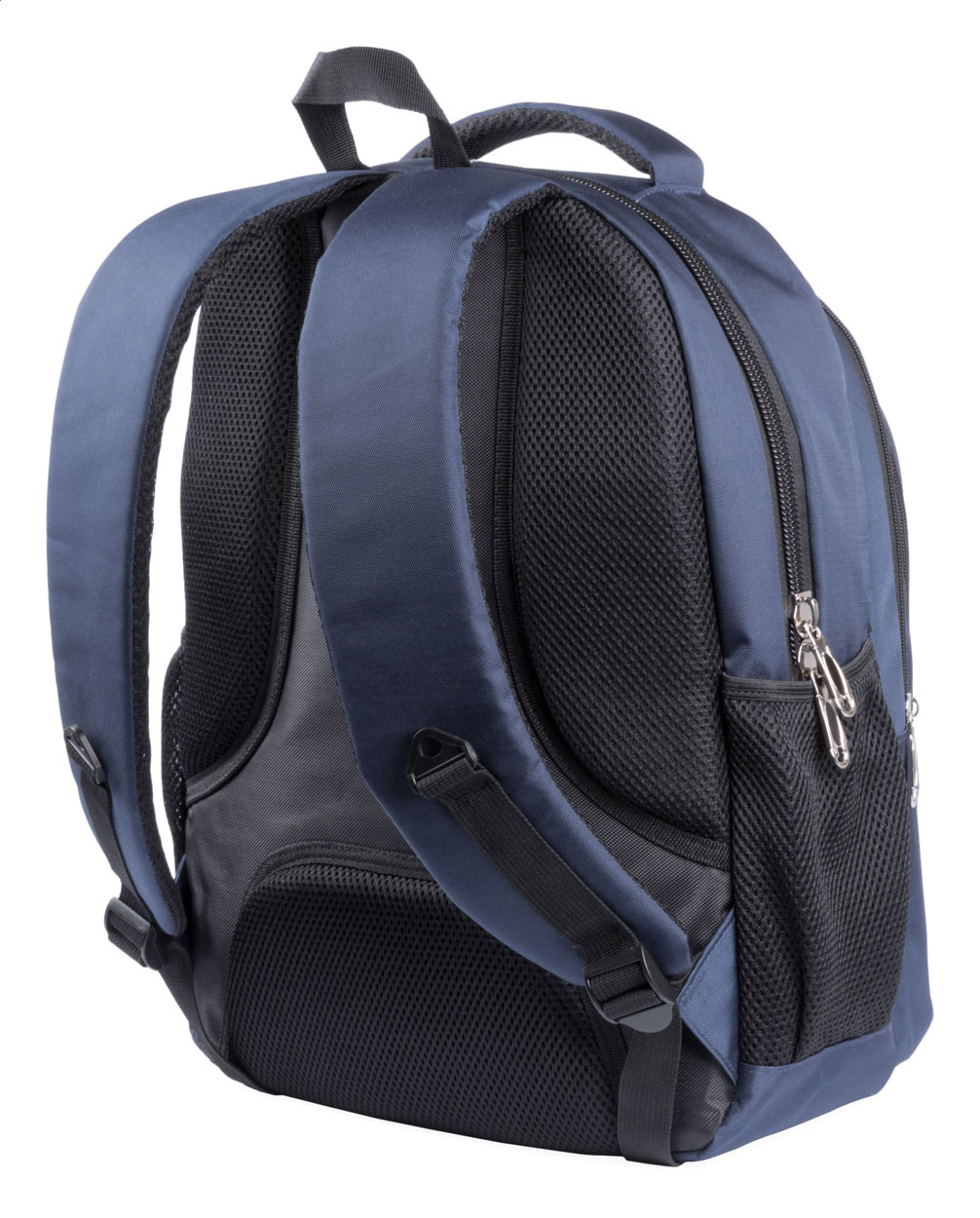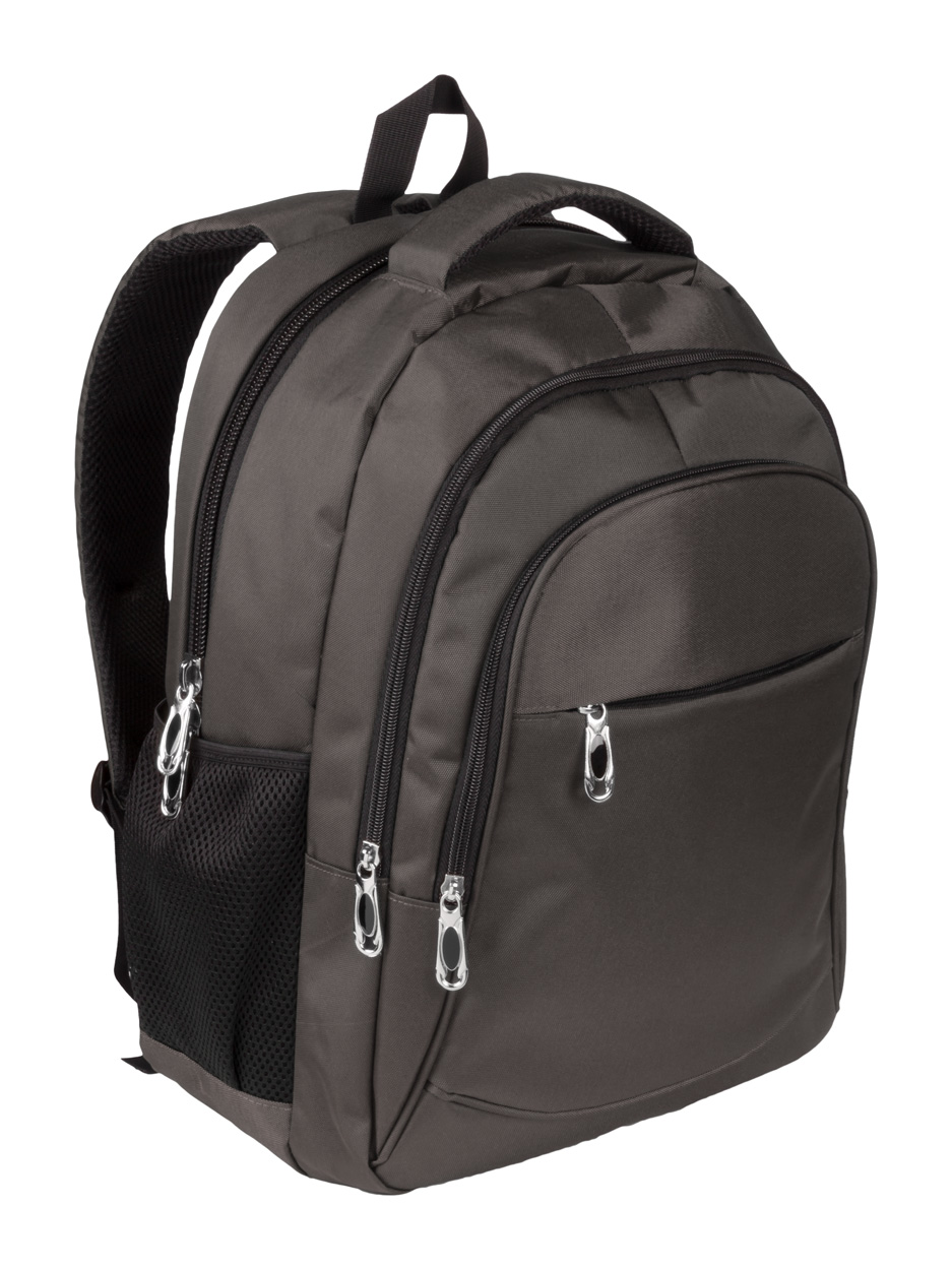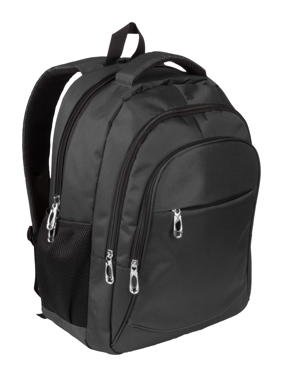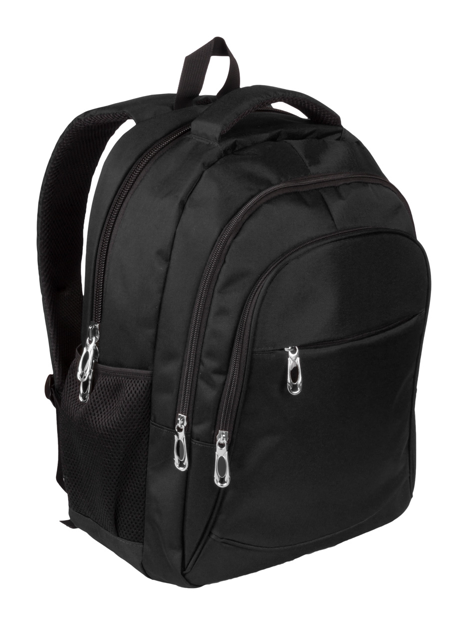 Zaino in nylon 600D con scomparti multipli chiusi da zip, tasca imbottita per laptop (15"), schiena e spallacci.