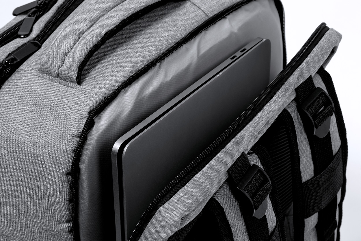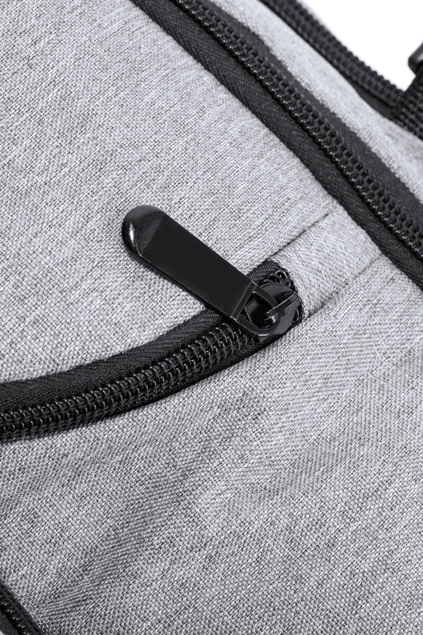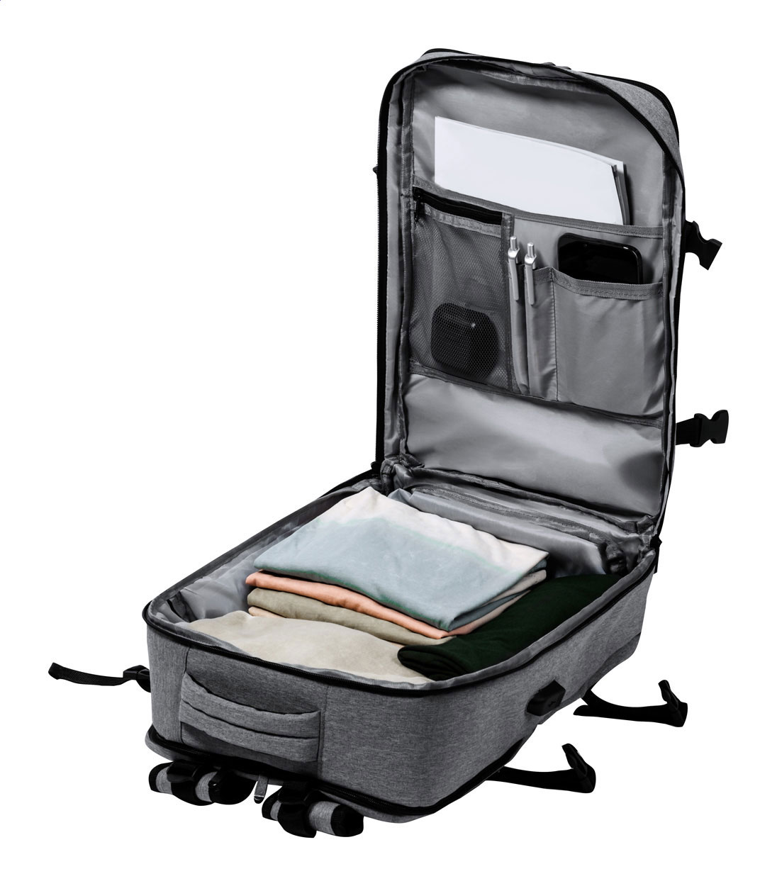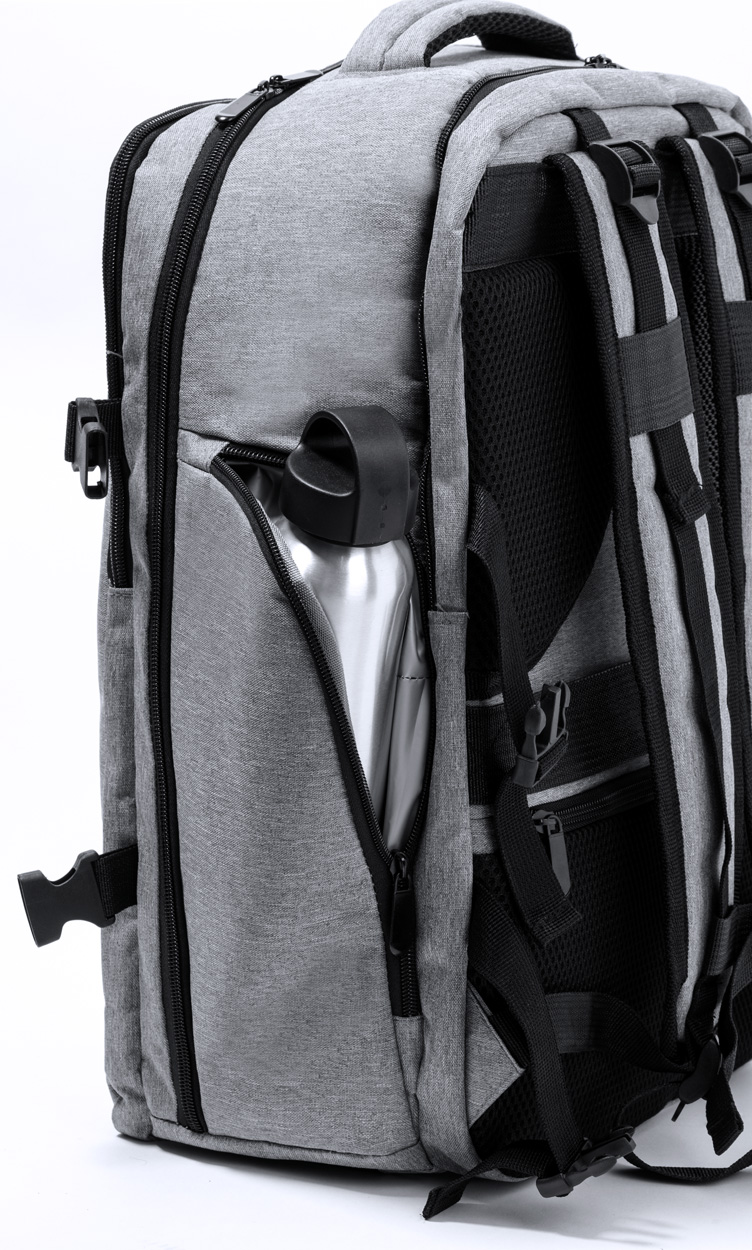 Zaino RPET resistente all'acqua con 3 scomparti principali con cerniera, 2 tasche anteriori con cerniera, tasca laterale con cerniera e tasca antifurto nascosta. Con scomparti imbottiti per laptop (17") e scarpe, schienale e spallacci imbottiti. Con cinghia per trolley e connessione USB integrata per power bank. Poliestere RPET 300D con etichetta distintiva RPET.