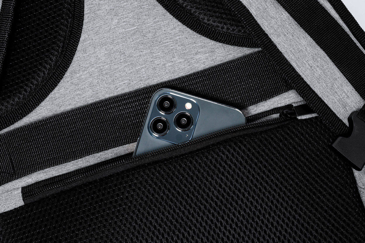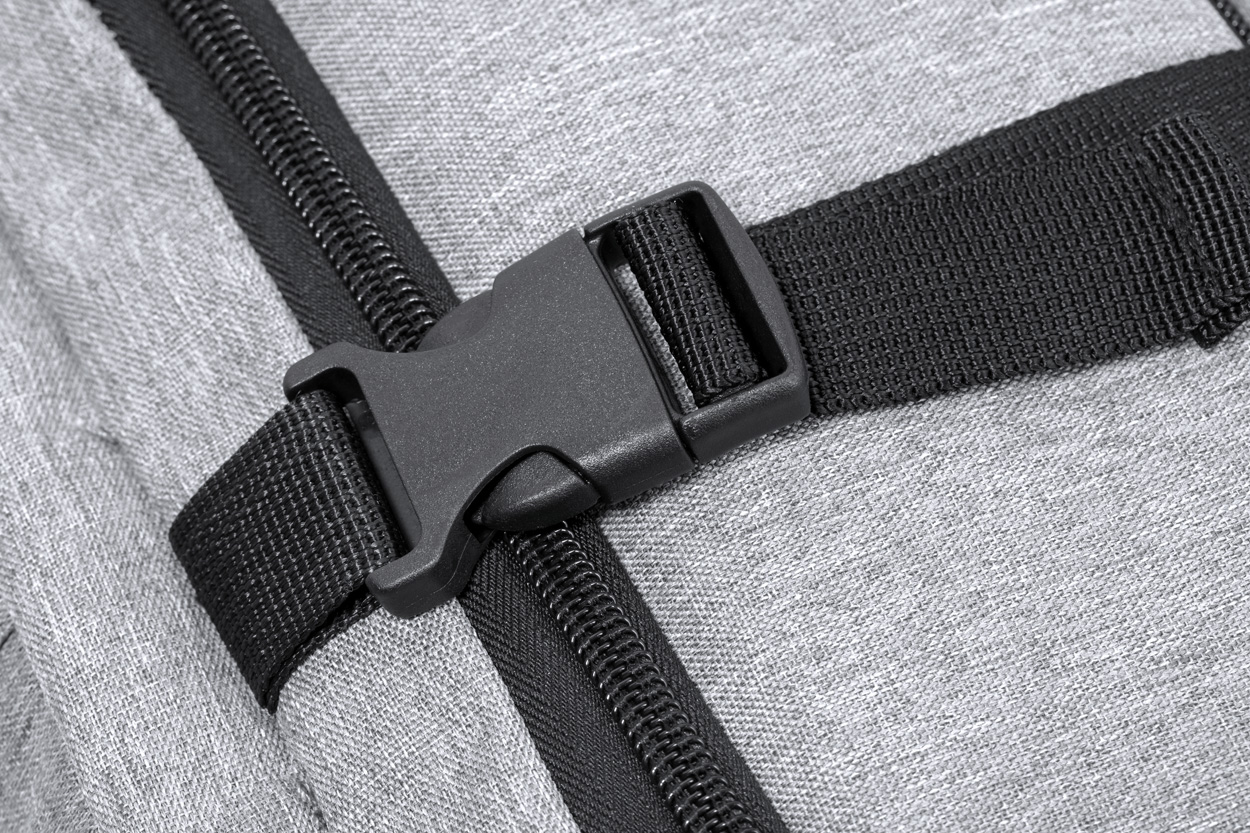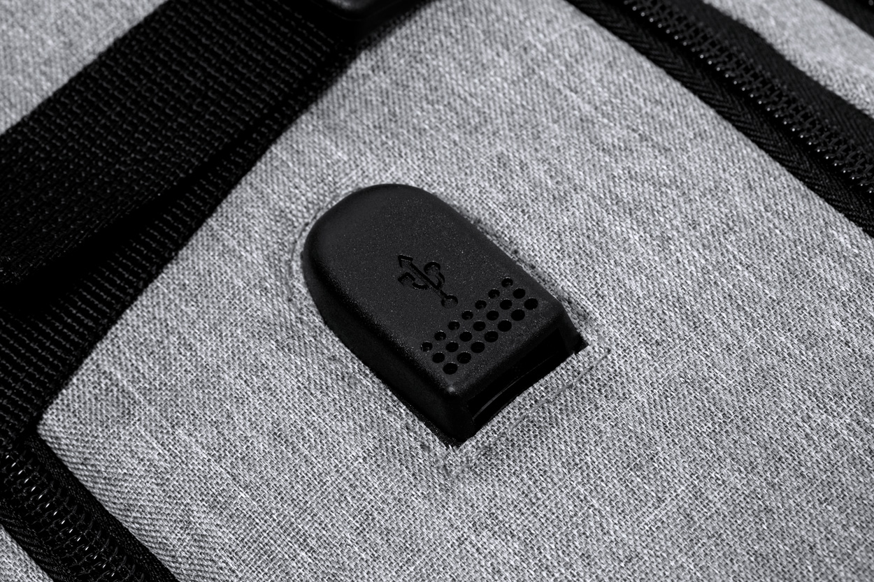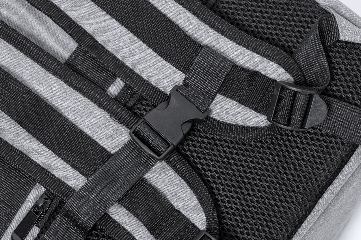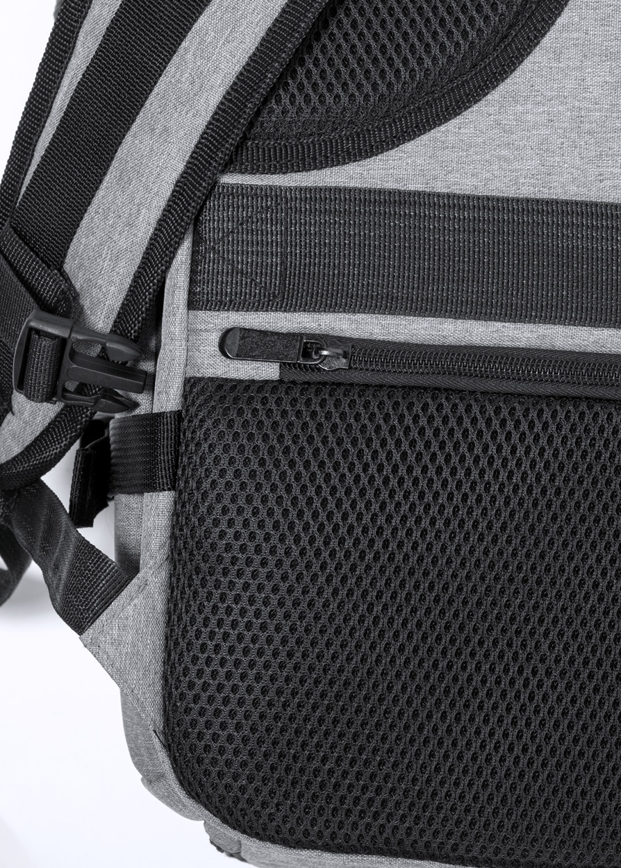 Zaino RPET resistente all'acqua con 3 scomparti principali con cerniera, 2 tasche anteriori con cerniera, tasca laterale con cerniera e tasca antifurto nascosta. Con scomparti imbottiti per laptop (17") e scarpe, schienale e spallacci imbottiti. Con cinghia per trolley e connessione USB integrata per power bank. Poliestere RPET 300D con etichetta distintiva RPET.