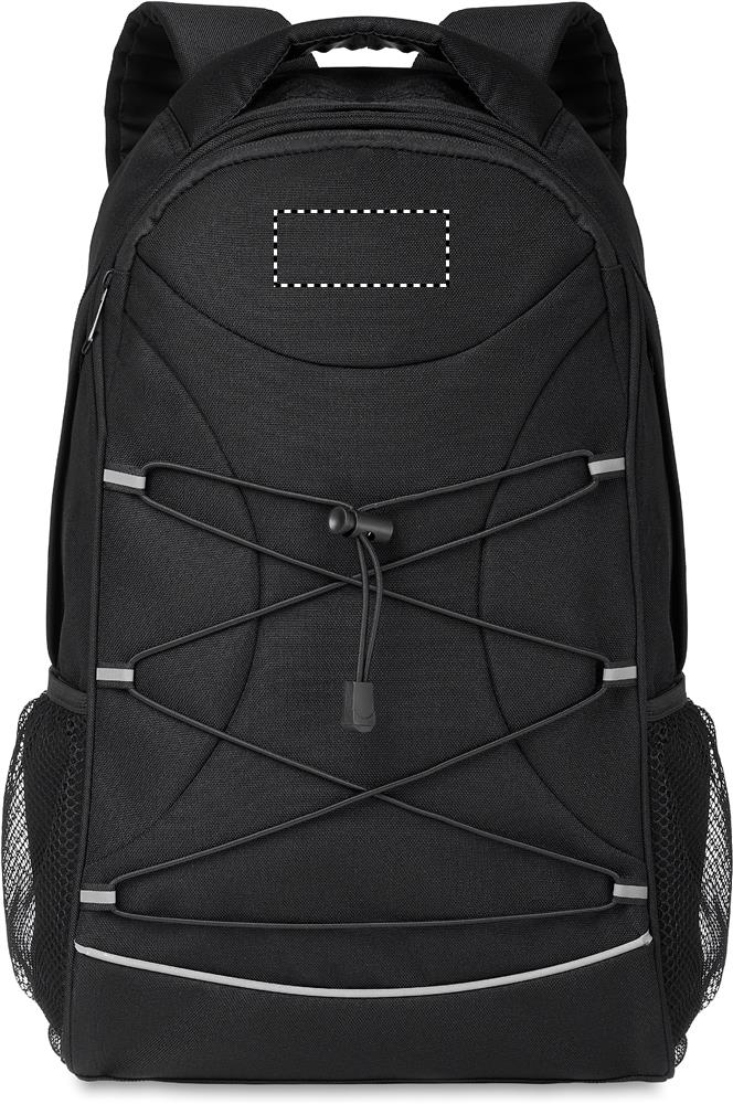 Zaino in RPET 600D con cordini scuri sul davanti e dettagli riflettenti. Tasche laterali in rete.