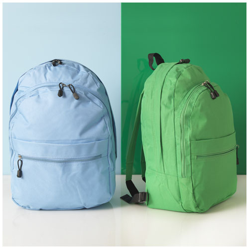 Il confortevole zaino Trend è un vincente tra gli zaini promozionali. Portando questa borsa, il destinatario farà in modo che qualsiasi marchio o messaggio venga diffuso ovunque vada. La borsa dal design trendy ha quattro scomparti: due scomparti con cerniera, una tasca frontale con cerniera e una tasca frontale con chiusura a gancio. Pertanto, offre molto spazio per riporre oggetti grandi e piccoli. L'articolo è realizzato in poliestere 600D, un materiale resistente, adatto a zaini di alta qualità.