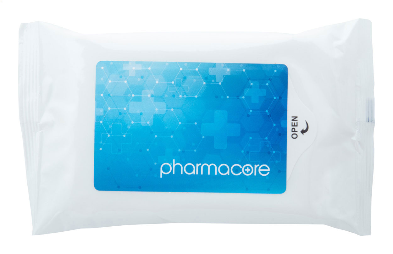 10 salviette umidificate in sacchetto risigillabile. Dimensioni delle salviette non piegate: 19×16 cm. Ideale per personalizzazione tampografica o con adesivo vinilico a colori.