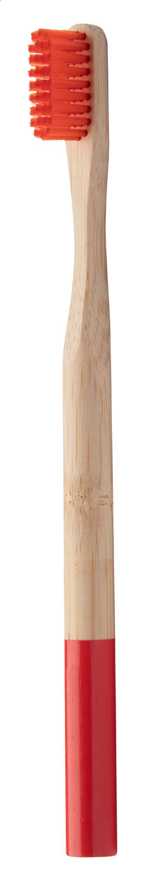Spazzolino da denti per adulti con manico bambù naturale e setole di nylon colorate. Manico con decorazione coordinata al colore delle setole. Fornito in confezione di cartoncino.