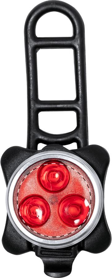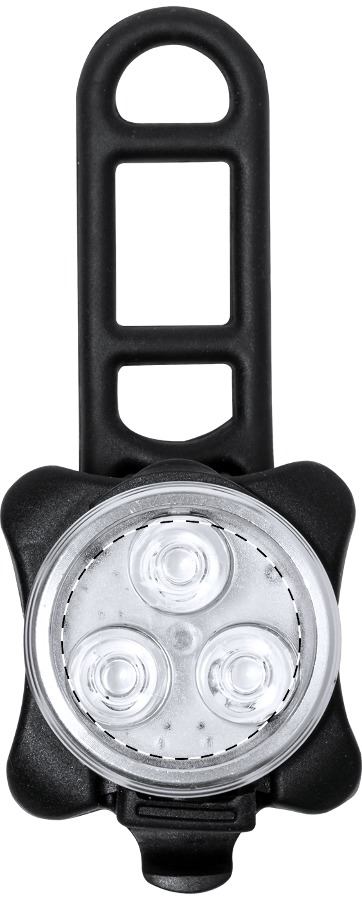 Set di luci per bicicletta in plastica con luce anteriore a 3 LED e lampeggiatore posteriore a 3 LED; batteria ricaricabile USB integrata (650 mAh) e cinghie elastiche. Modalità di funzionamento a luce fissa e lampeggiante. Cavo di ricarica USB incluso.