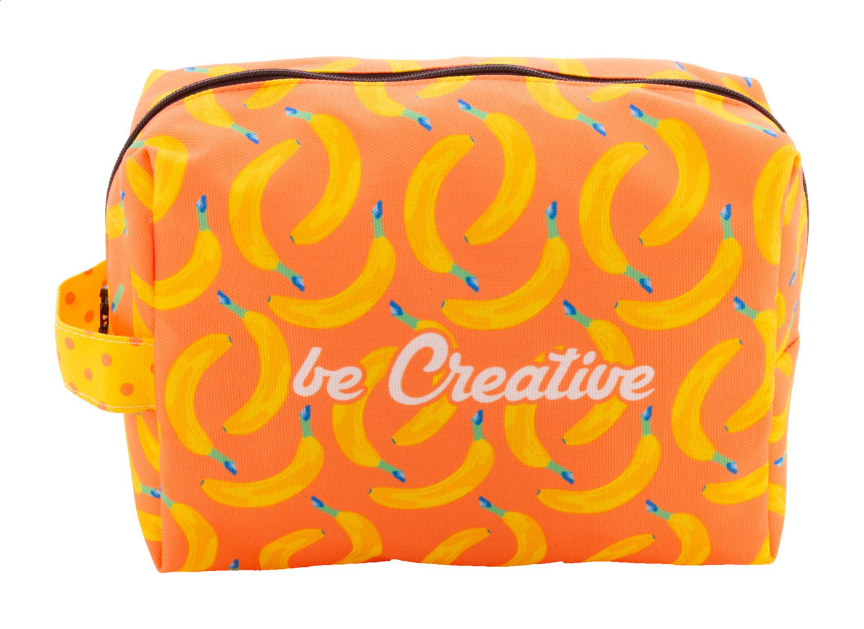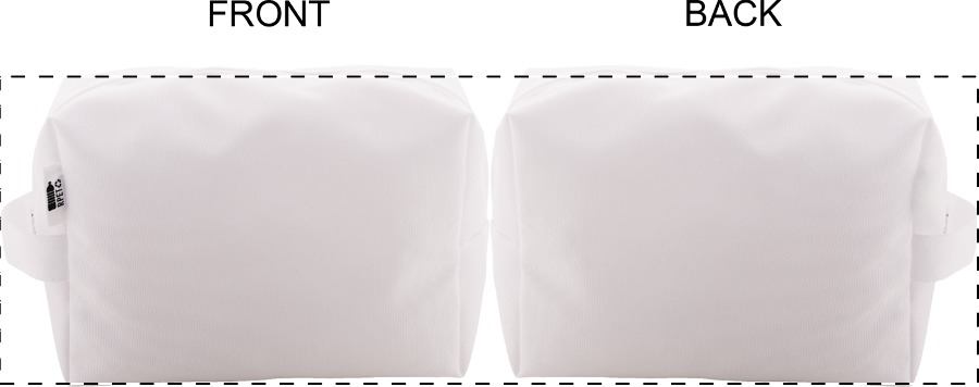 Beauty per cosmetici in poliestere 600D RPET con grafica stampata in sublimazione su tutta la superfice, con zip e maniglia. MOQ: 50pz.