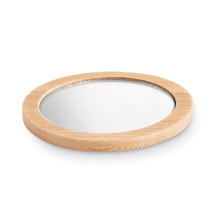 Specchio da trucco, forma rotonda, in bamboo. Presentato in un sacchetto di cotone con coulisse. Lo specchio ha un effetto di ingrandimento.