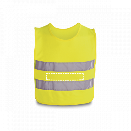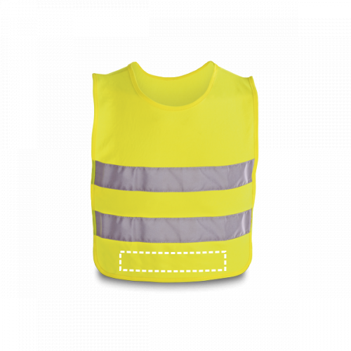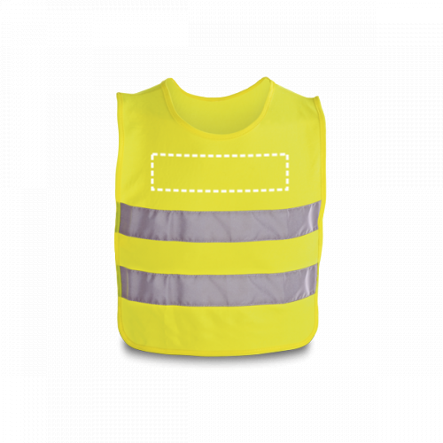 Gilet riflettente per bambini. 100% poliestere. Certificato dalla normativa EN 17353. Con 2 bande riflettenti orizzontali. Aperto con velcro laterale. Prodotto per uso non professionale