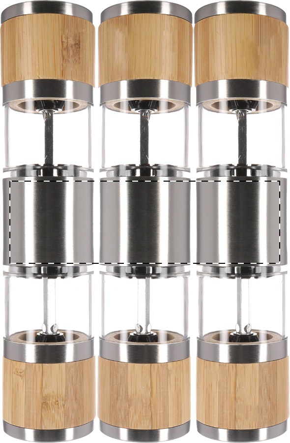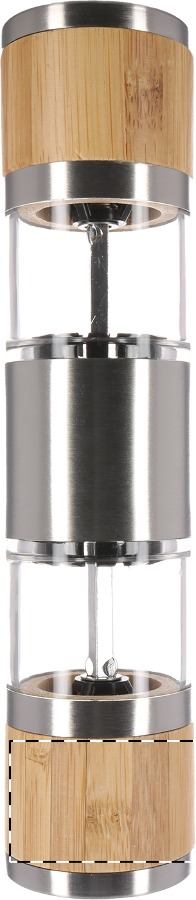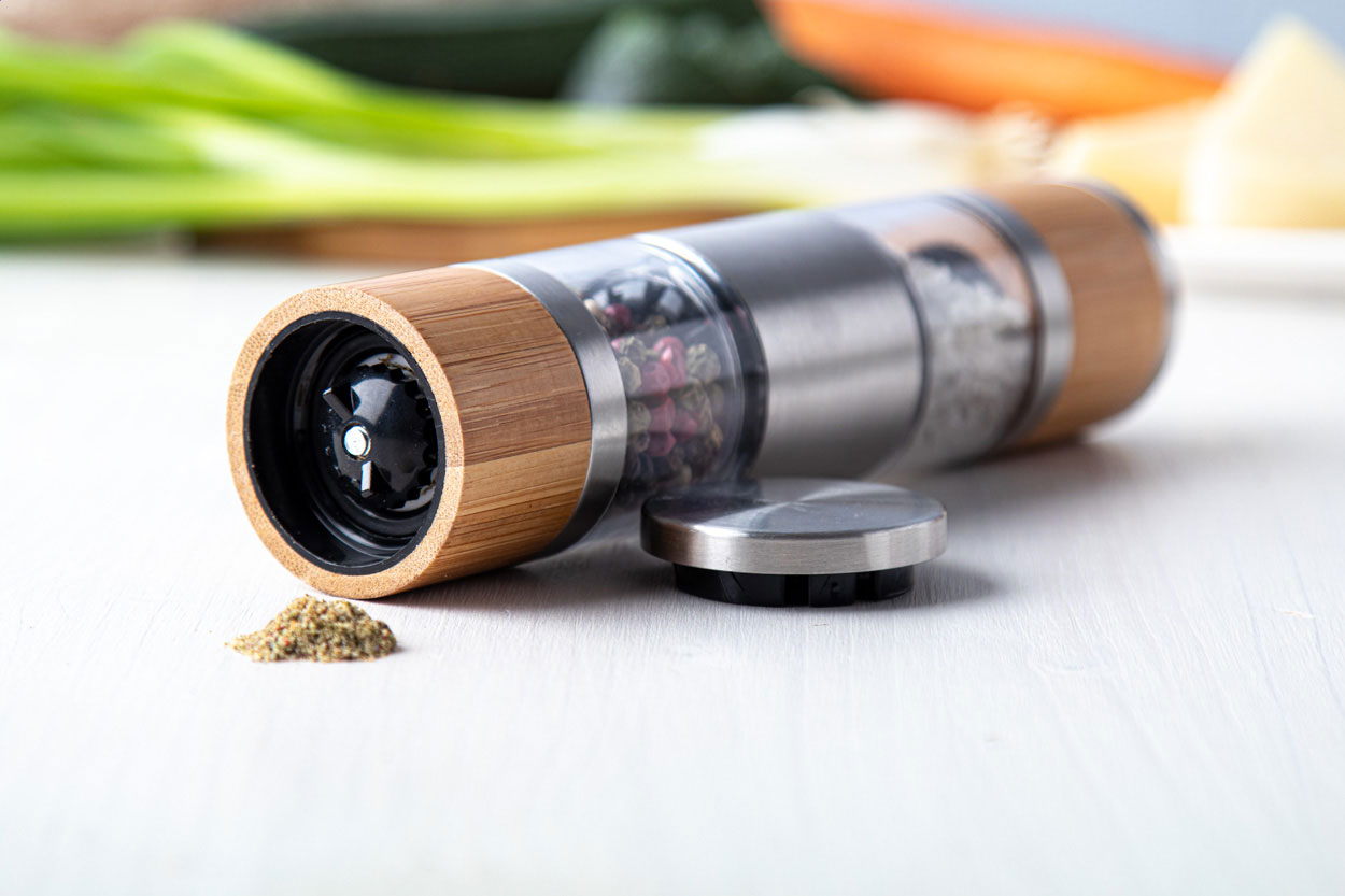 Doppia macina manuale per sale e pepe; macine in ceramica, corpo in acciaio inox e bambù.