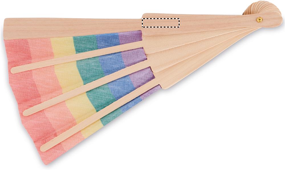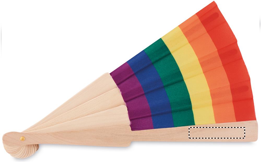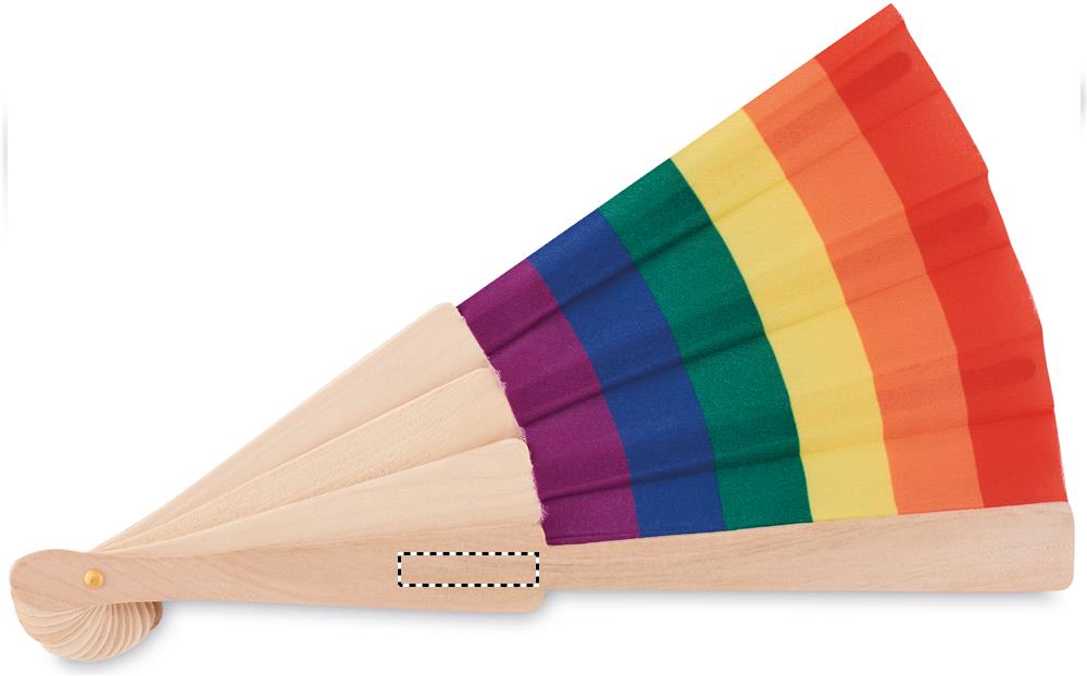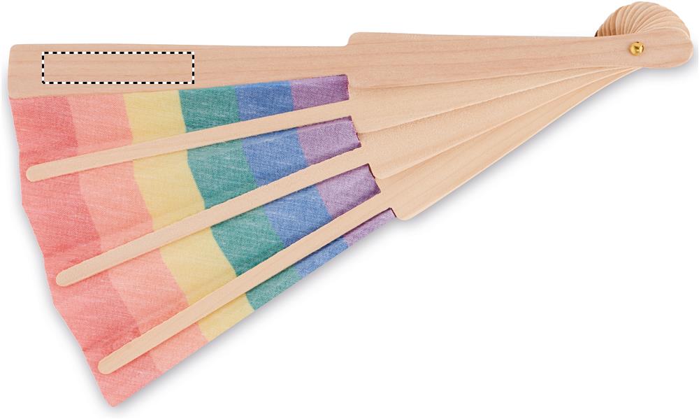 Ventaglio in legno e tessuto di poliestere con motivo arcobaleno.