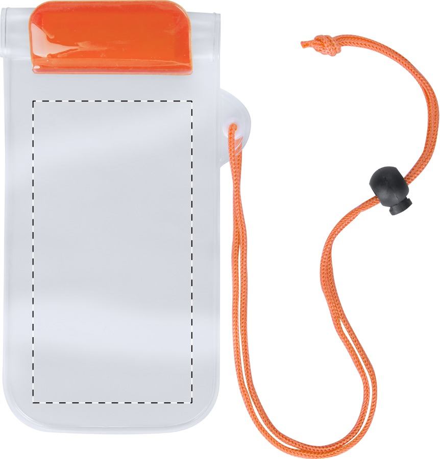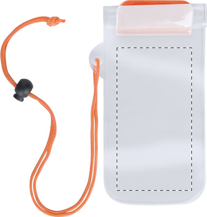 Custodia cellulare impermeabile in plastica con laccino da collo.
