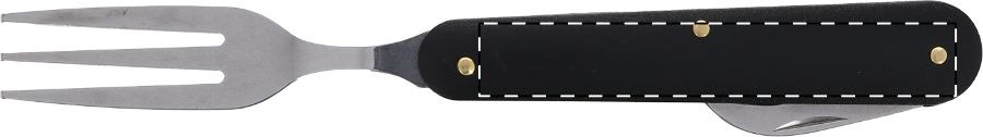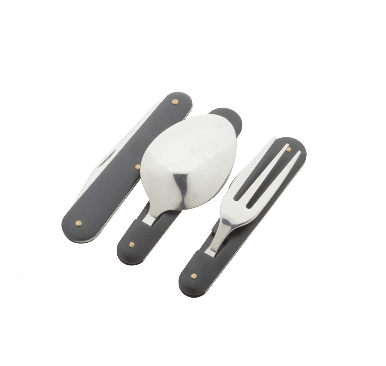 Set di posate da campeggio pieghevoli in acciaio inox con manici in alluminio. Include forchetta, coltello e cucchiaio. In astuccio nero.