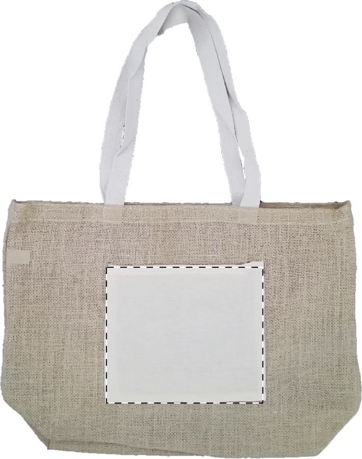 Borsa da spiaggia in juta con tasca frontale e manici in colore coordinato.