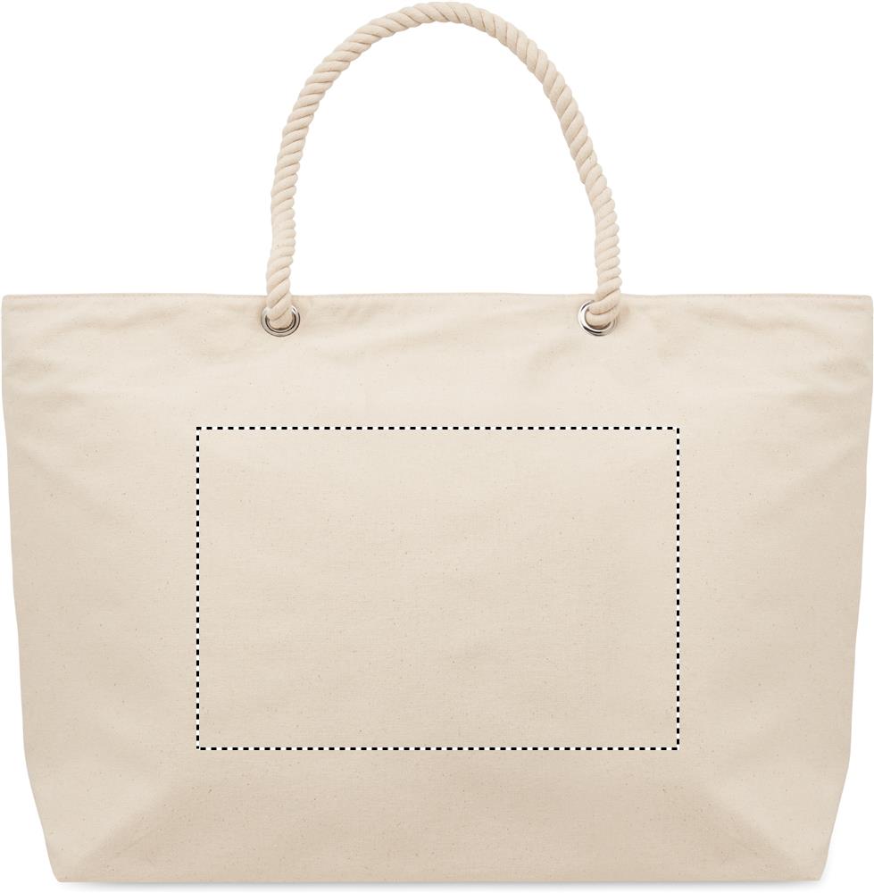 Borsa termica da spiaggia con cerniera in cotone con manico in corda. 220 gr/m². Isolamento in foglio di alluminio da 2 mm.