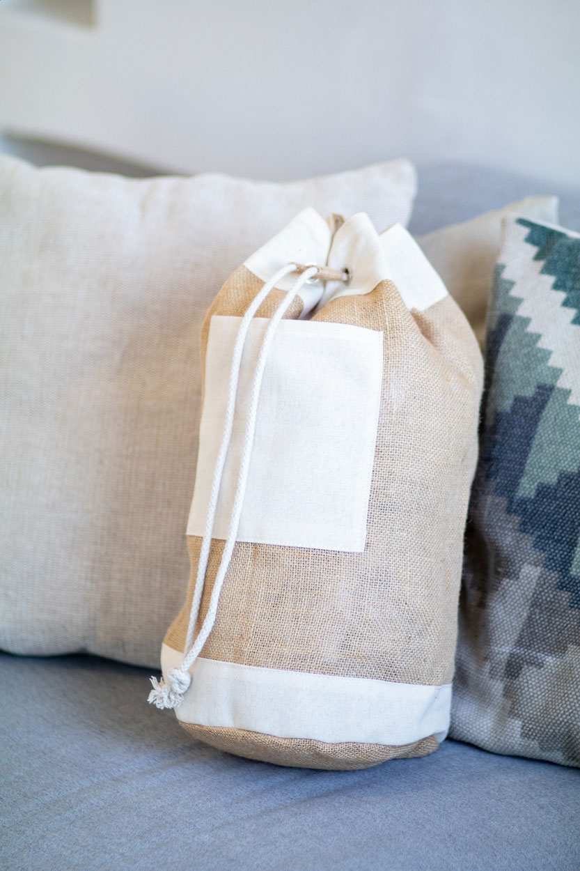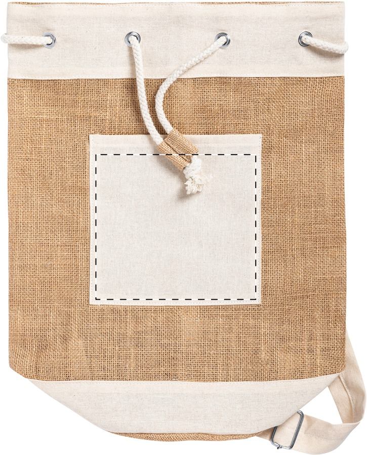 Sacca marinaio in iuta con tasca frontale in cotone e chiusura con coulisse.