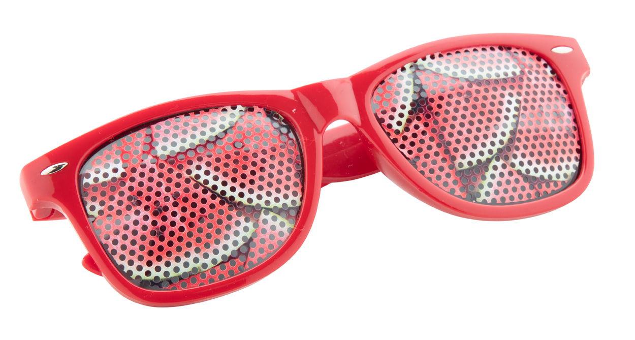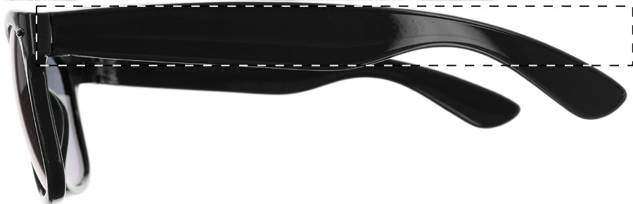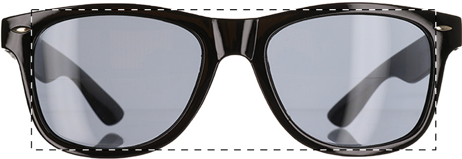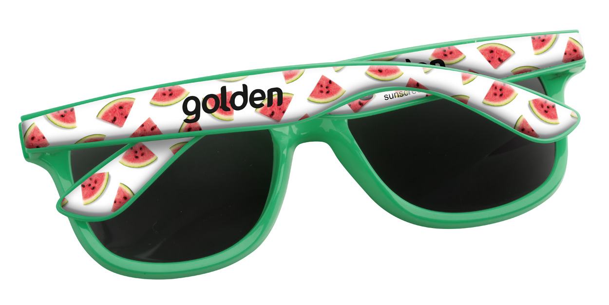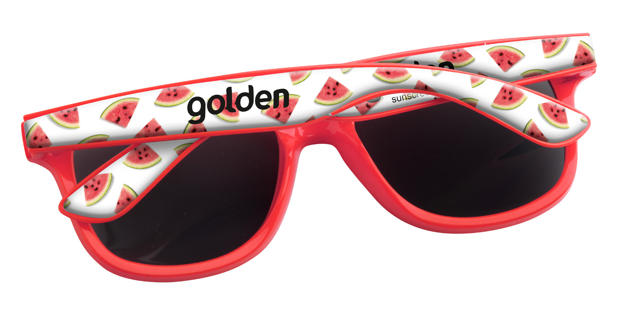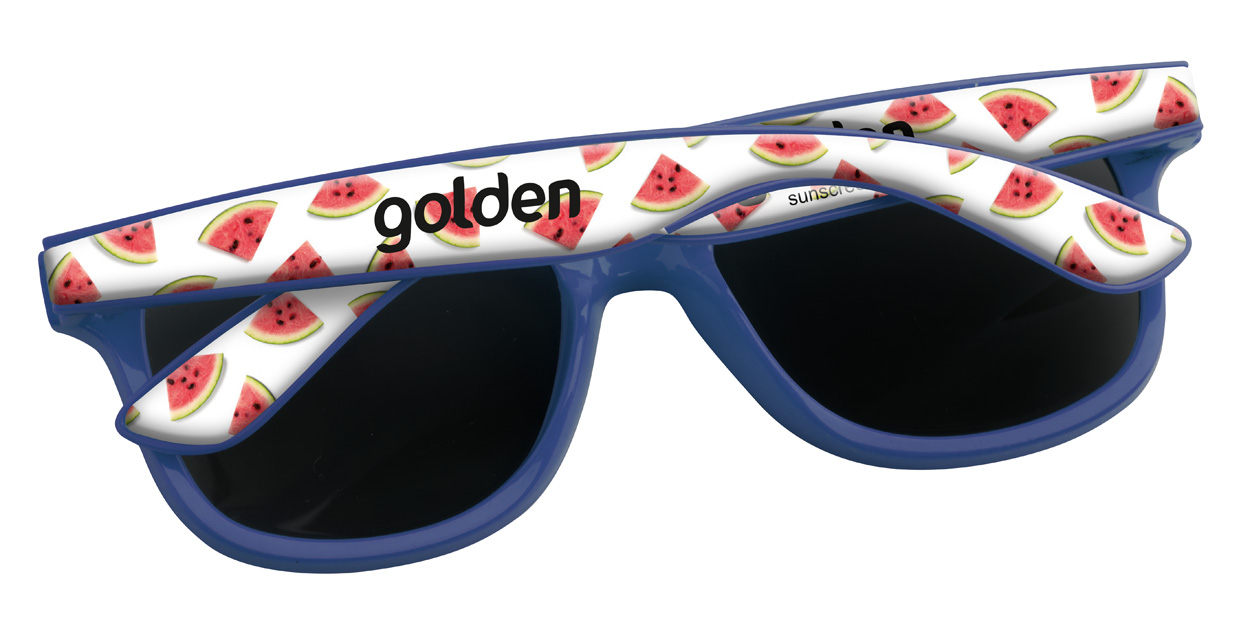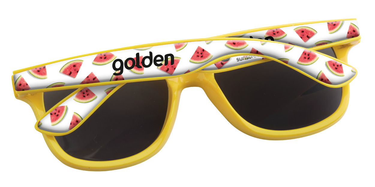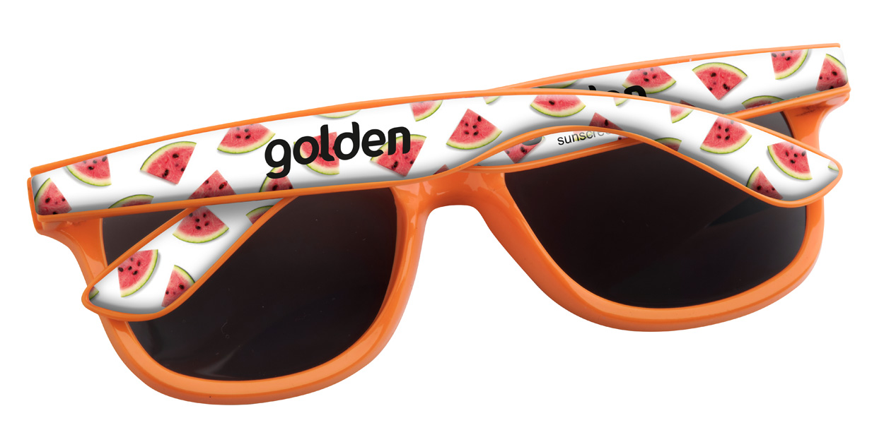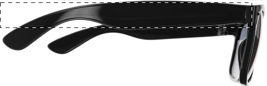 Occhiali da sole in plastica con protezione UV 400 ed astine personalizzabili con resina epossidica. Il prezzo include la stampa con resina epossidica sulle astine. MOQ: 100 pz.