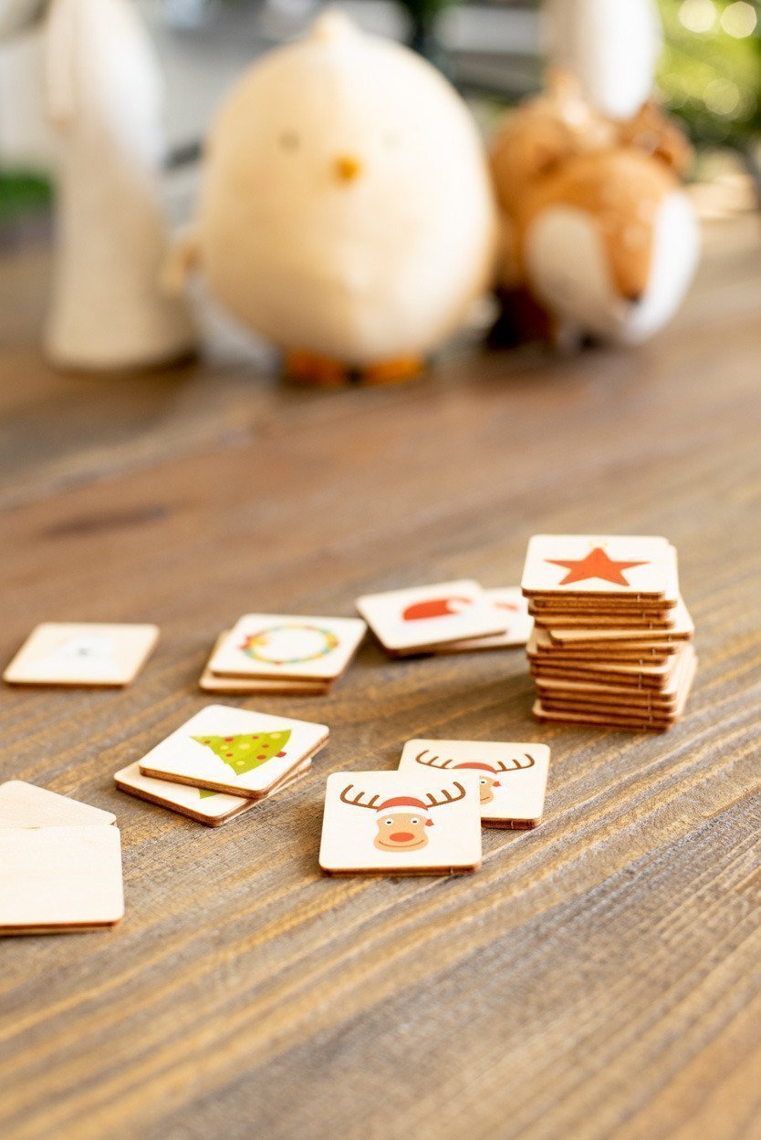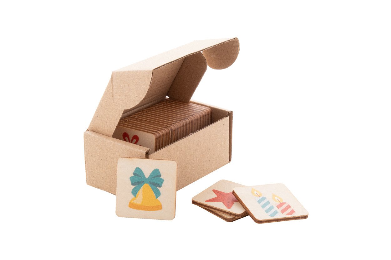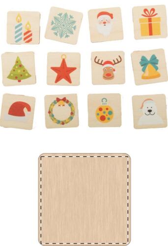 Gioco di memoria con 24 tessere (40x40 mm) in legno di betulla laminato con motivi Natalizi. Il prezzo include la stampa del logo a 1 colore sul retro di tutte le tessere. MOQ: 50 pezzi.