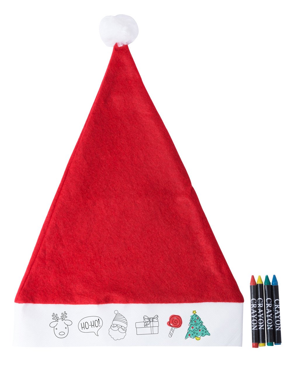 Cappello Babbo Natale in poliestere/TNT con 4 pastelli per colorare.