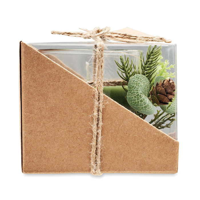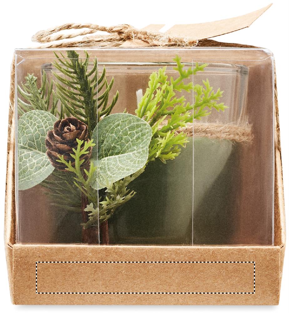 Portacandele in vetro (120 gr) con composizione naturale. Presentato in una scatola di cartone e PVC con corda di juta ed etichetta kraft.