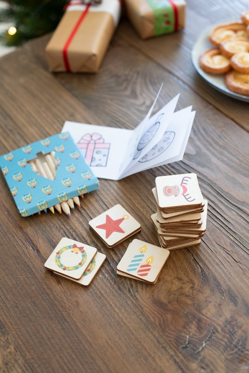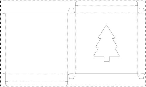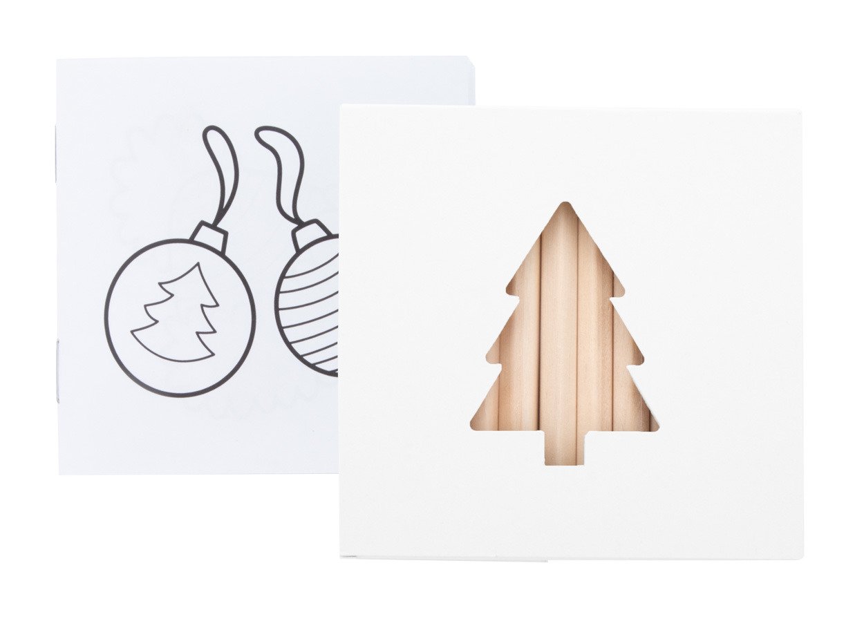 Set matite colorate in scatola di cartoncino personalizzabile a colori con finestra fustellata a forma di albero di Natale. Incluse matite in legno (12pz) e blocchetto da colorare. Minimo d'ordine 100pz.