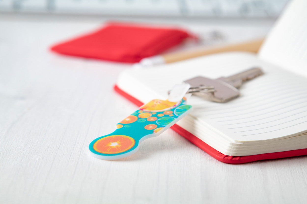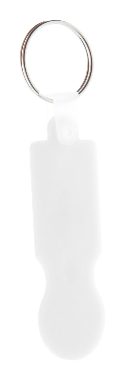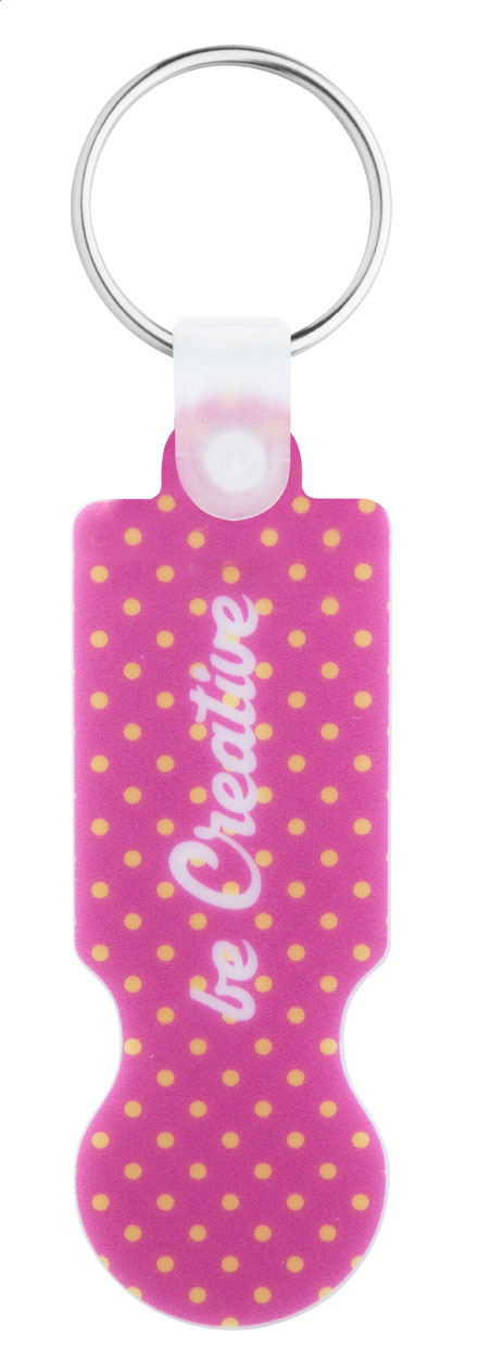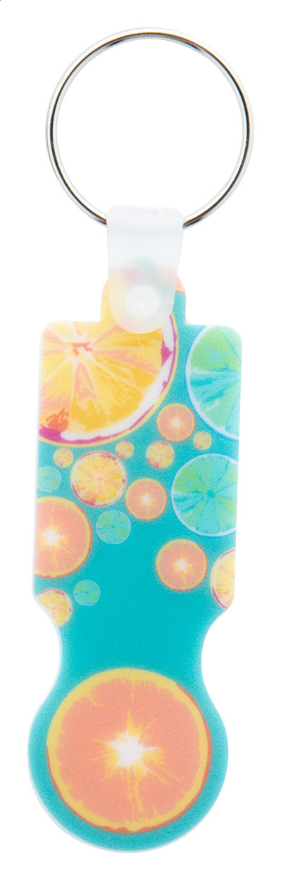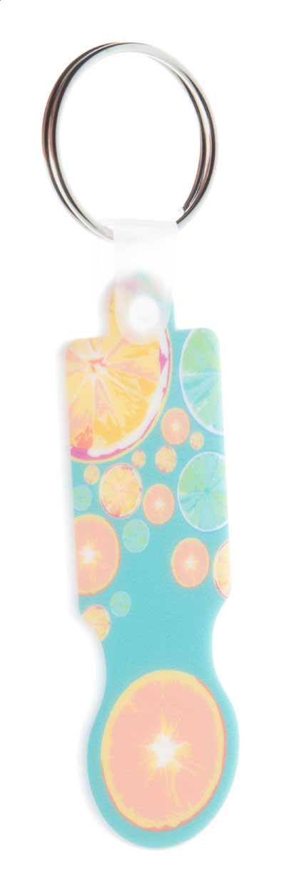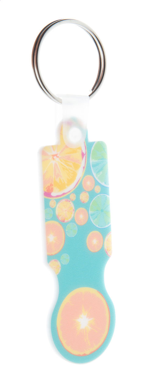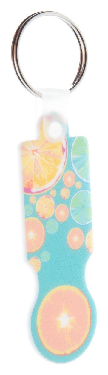 Portachiavi in plastica con inserto per carrelli della spesa e grafica a colori. Il prezzo comprende la stampa UV LED su un lato. MOQ: 200 pezzi.