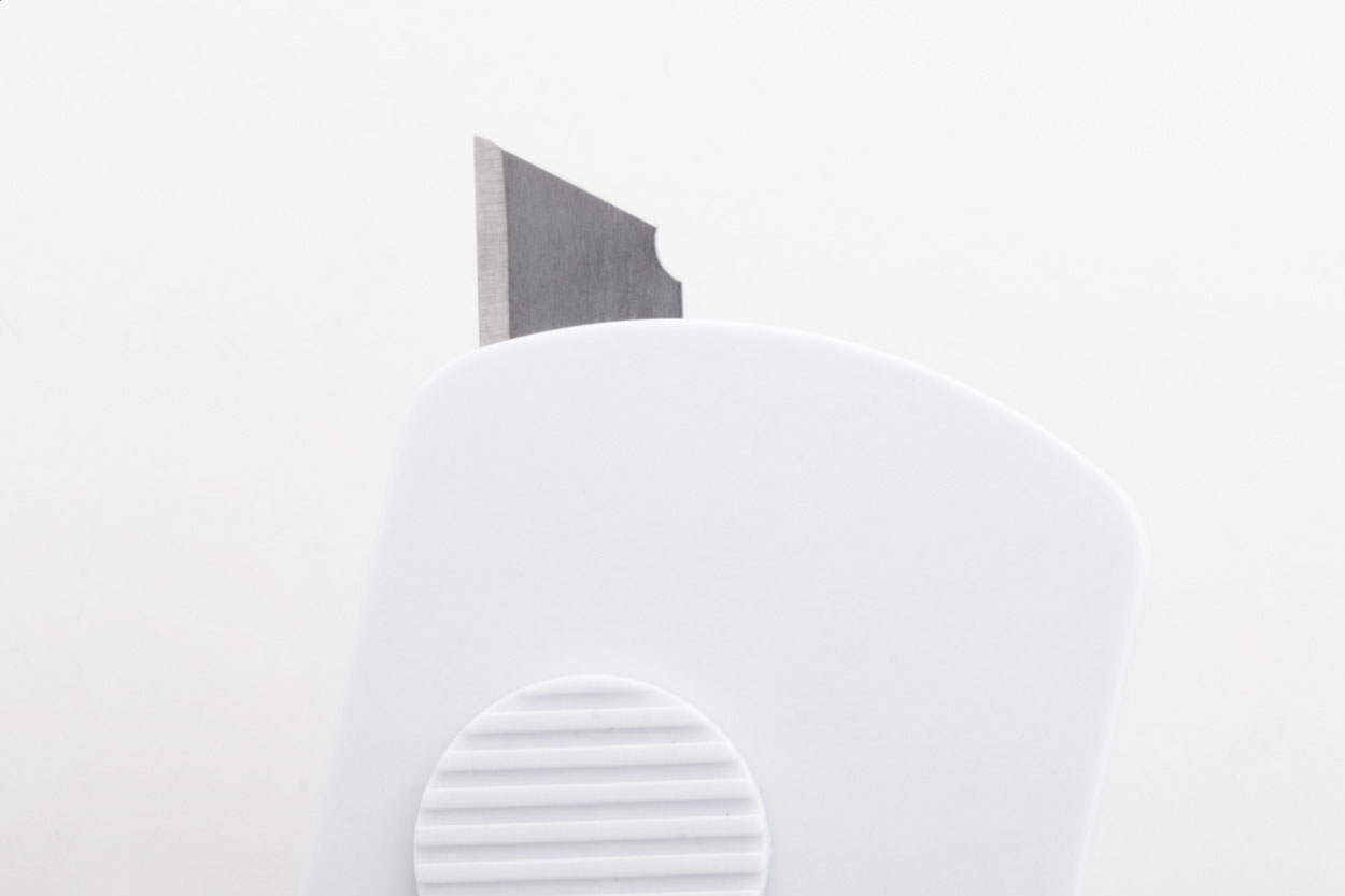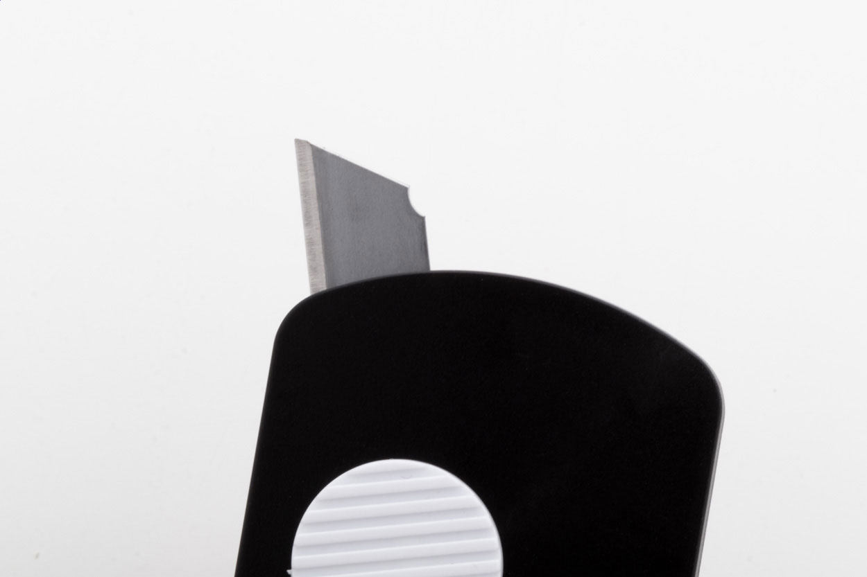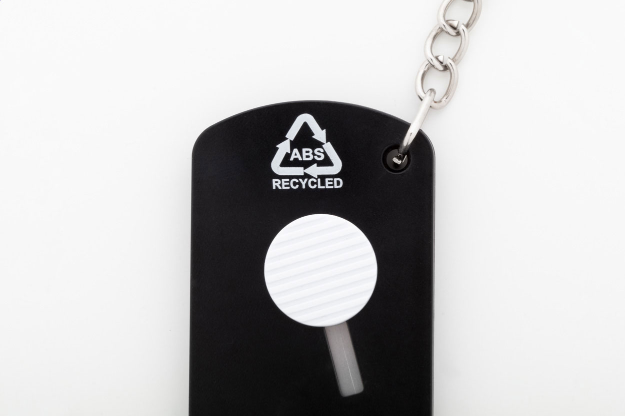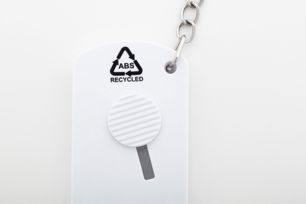 Coltello tagliacarte in plastica ABS riciclata e acciaio inossidabile con lama auto-retrattile e portachiavi in metallo.