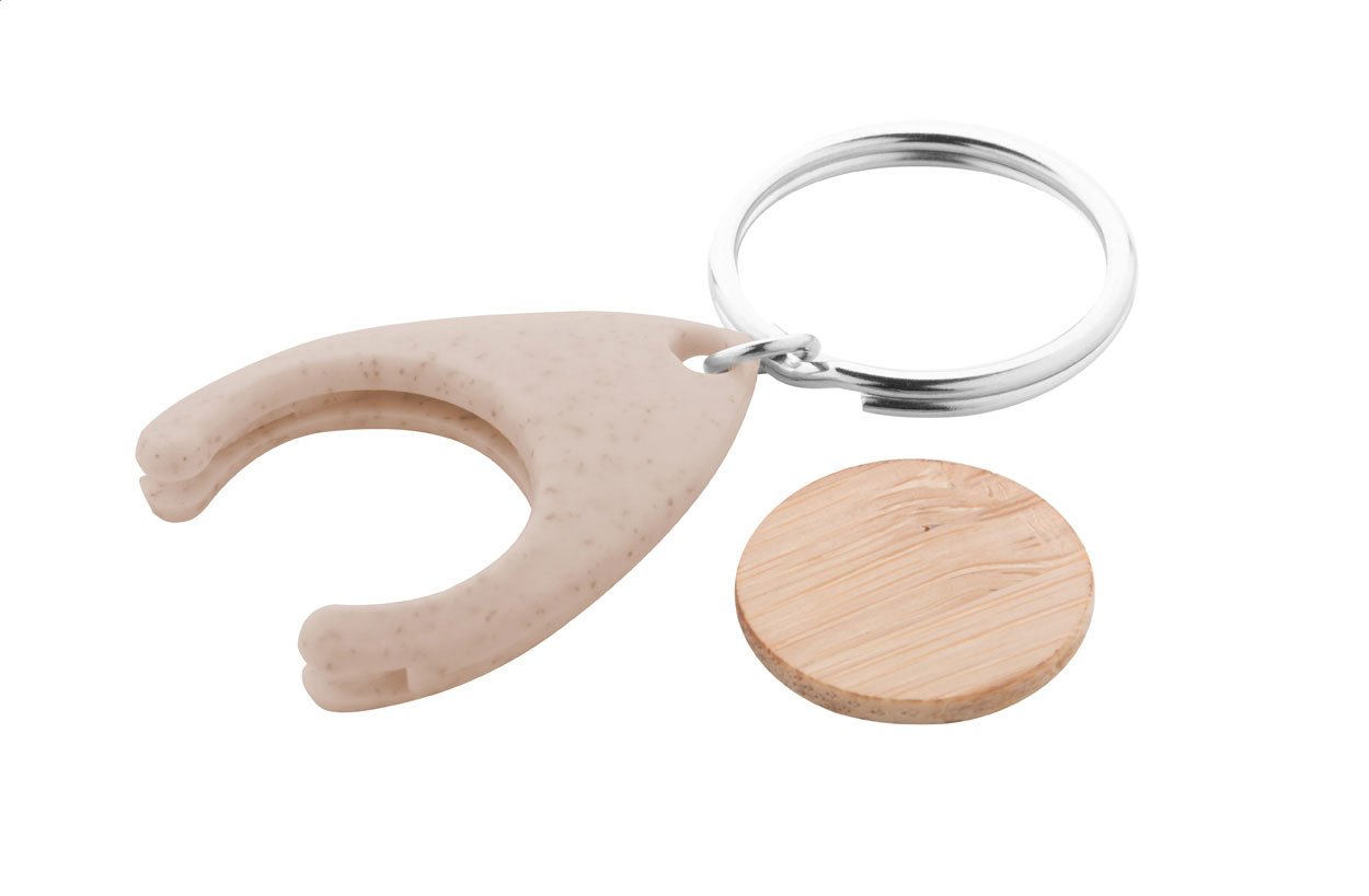 Portachiavi in plastica ecologica di paglia di grano con gettone per carrello della spesa in bambù.