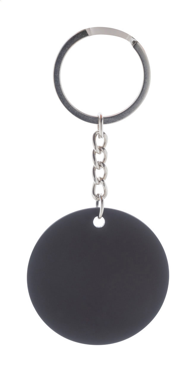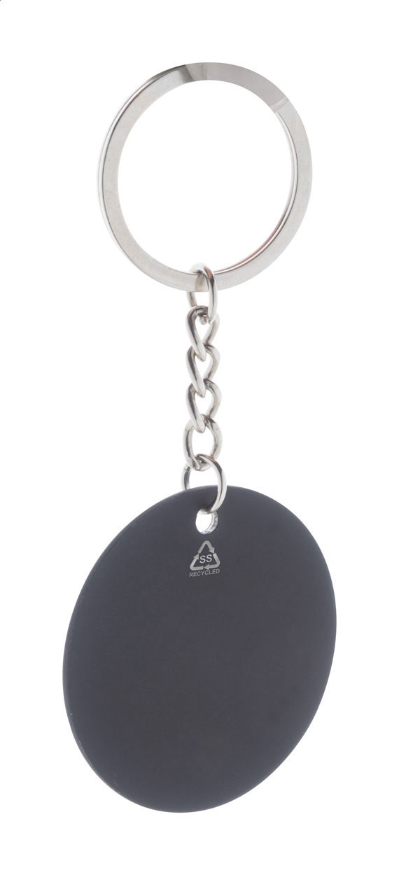 Portachiavi in acciaio riciclato di forma rotonda con finitura gommata. Trattamento speciale che permette l'incisione laser a specchio.