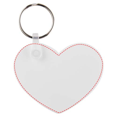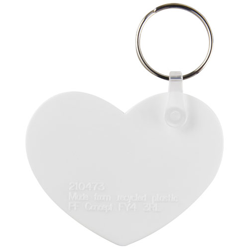 Portachiavi a forma di cuore, in plastica HIPS riciclata, personalizzabile sull'intera superfice, con anello in metallo.