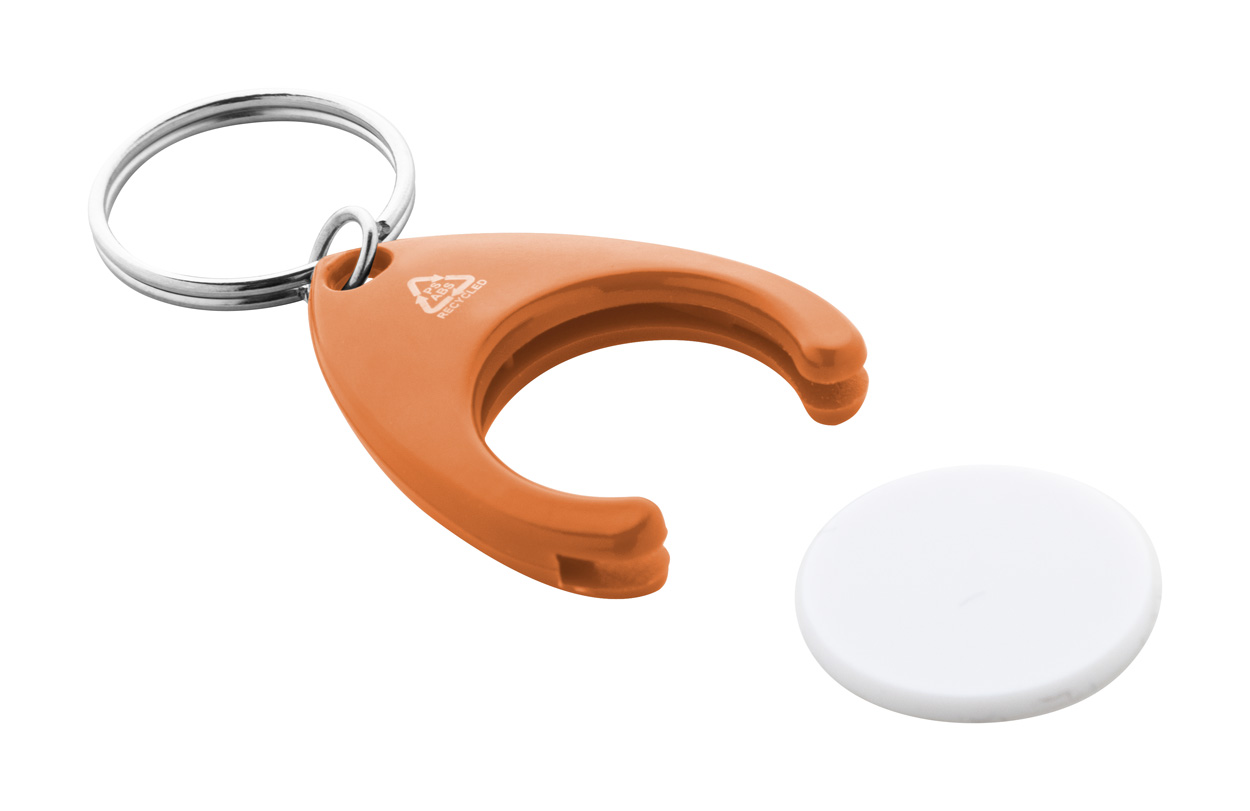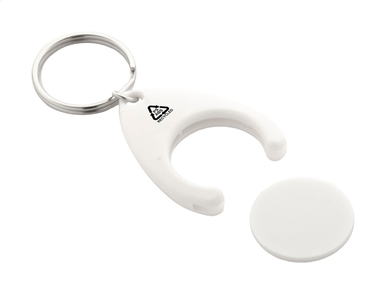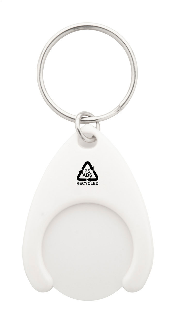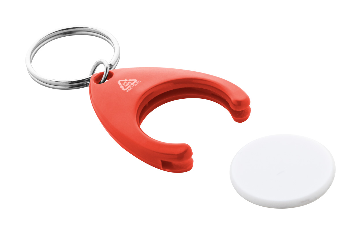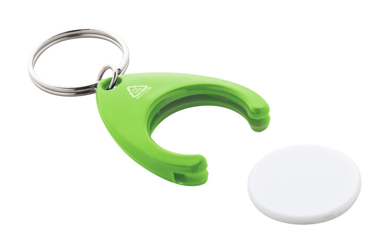 Portachiavi in plastica ABS e PS riciclata con moneta per il carrello della spesa ed anello in metallo. Dimensione moneta: ø24×2 mm.