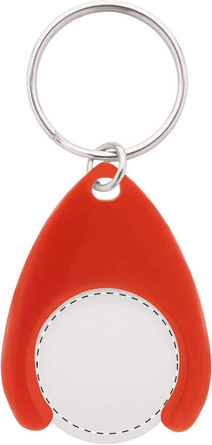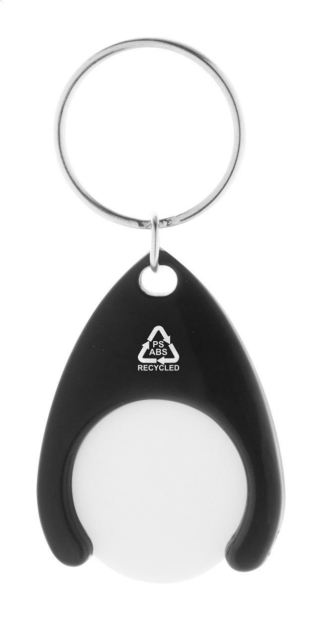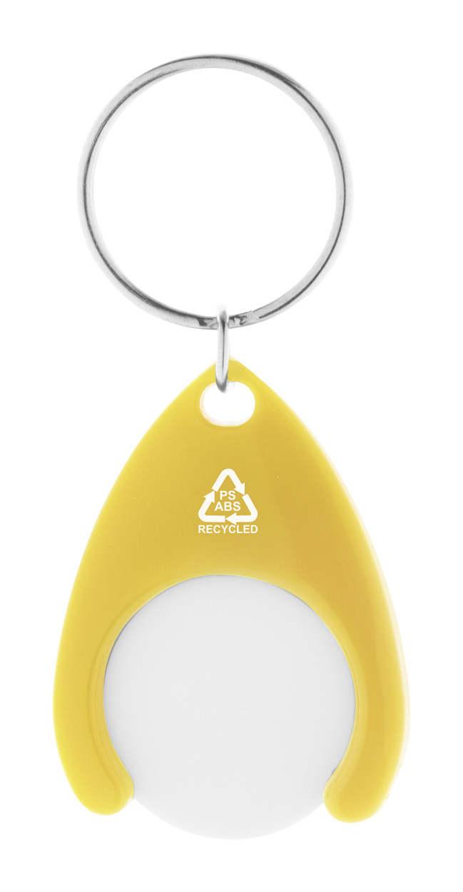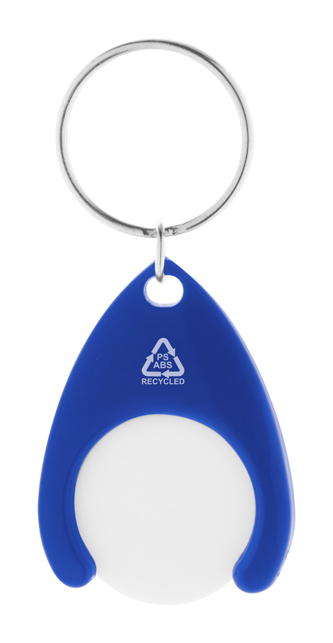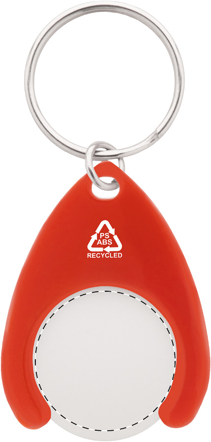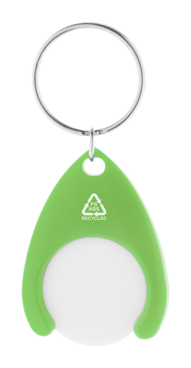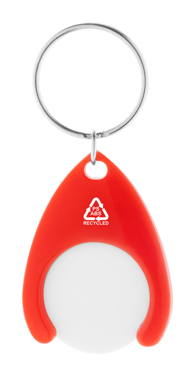 Portachiavi in plastica ABS e PS riciclata con moneta per il carrello della spesa ed anello in metallo. Dimensione moneta: ø24×2 mm.