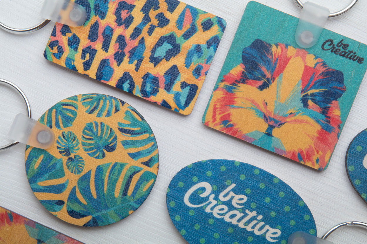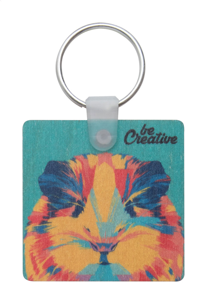 Portachiavi in legno di betulla laminato di forma quadrata con stampa a colori. Il prezzo include la stampa UV LED su un solo lato. Quantità minima: 200 pezzi.