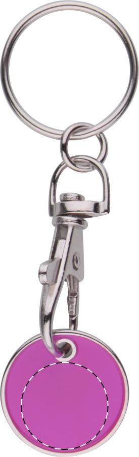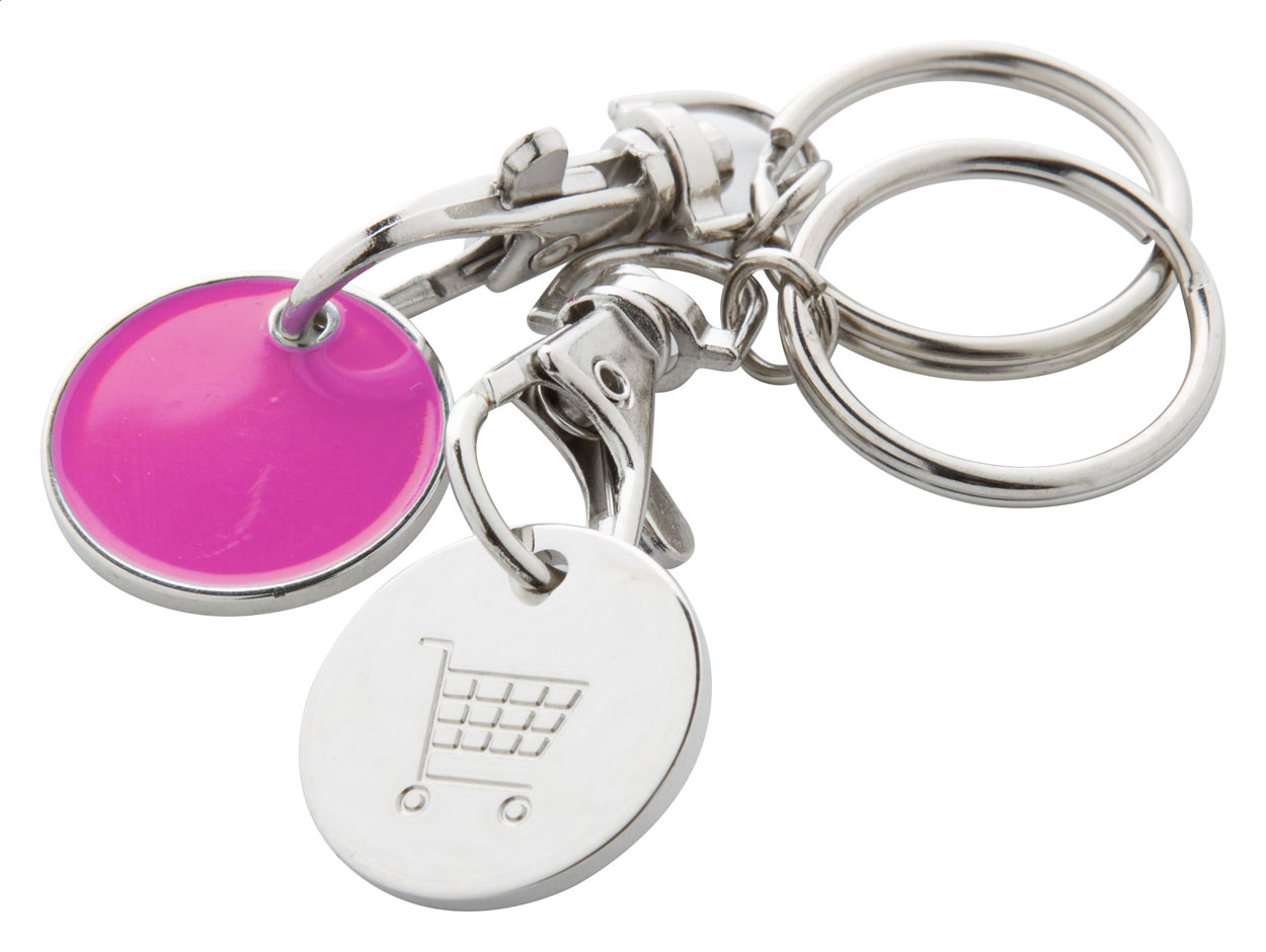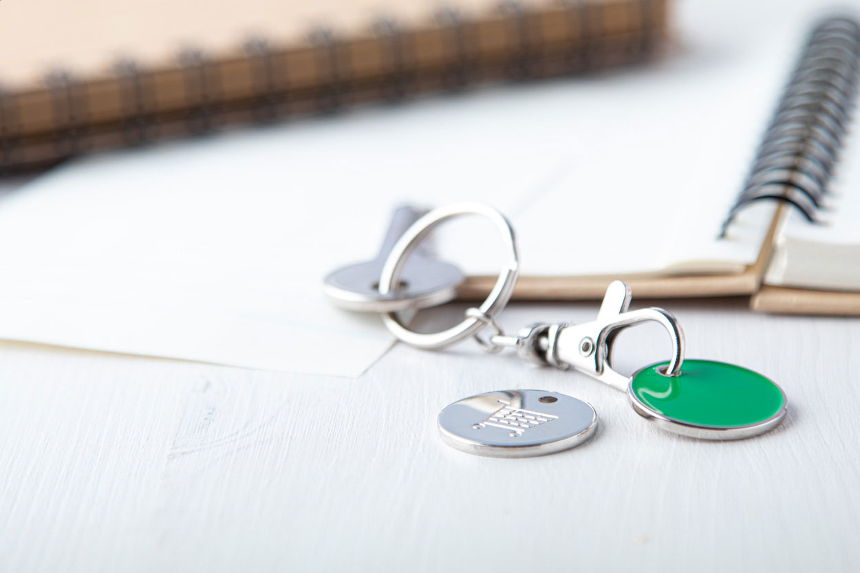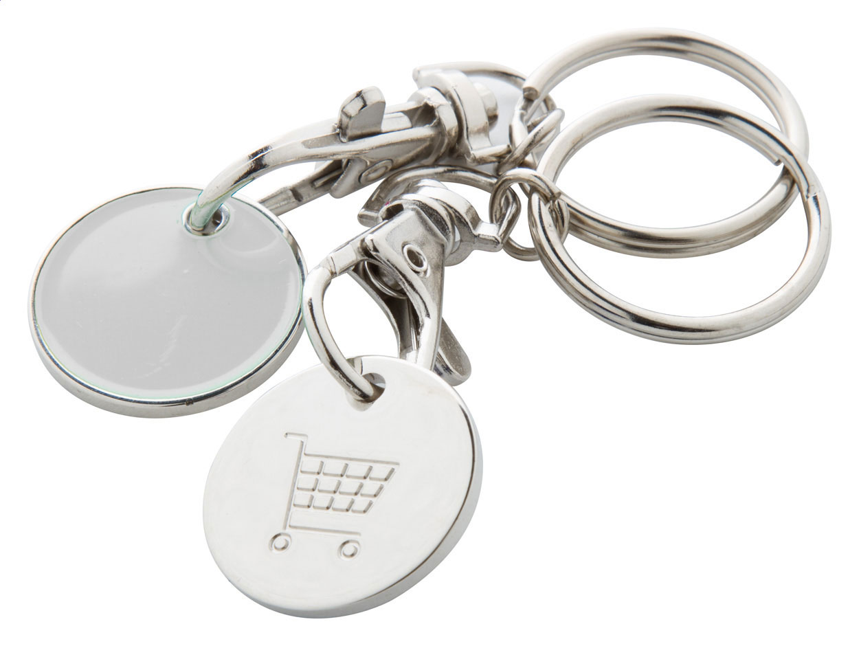Portachiavi in metallo con gettone per carrello della spesa. Un lato del gettone è colorato mentre su l'altro è inciso un carrello della spesa. Dimensioni della moneta: ø23×1,7 mm.