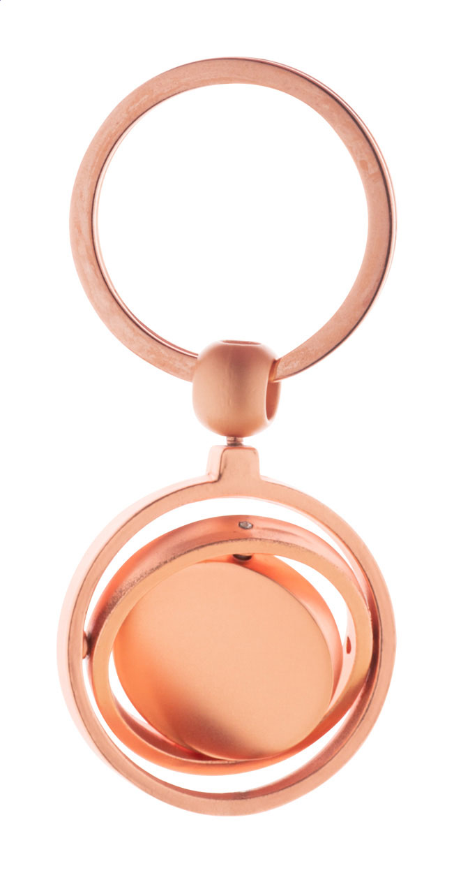 Portachiavi in metallo con finitura dorata e parte interna ruotabile. Confezione in scatola di cartoncino kraft.