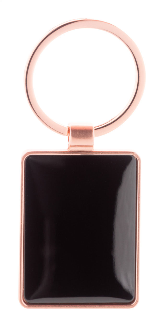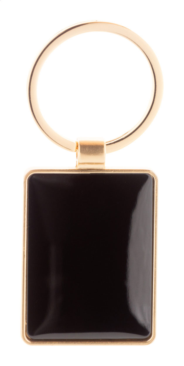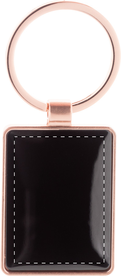 Portachiavi rettangolare in metallo con finitura dorata e placca color canna di fucile. Confezione in scatola di cartoncino kraft.