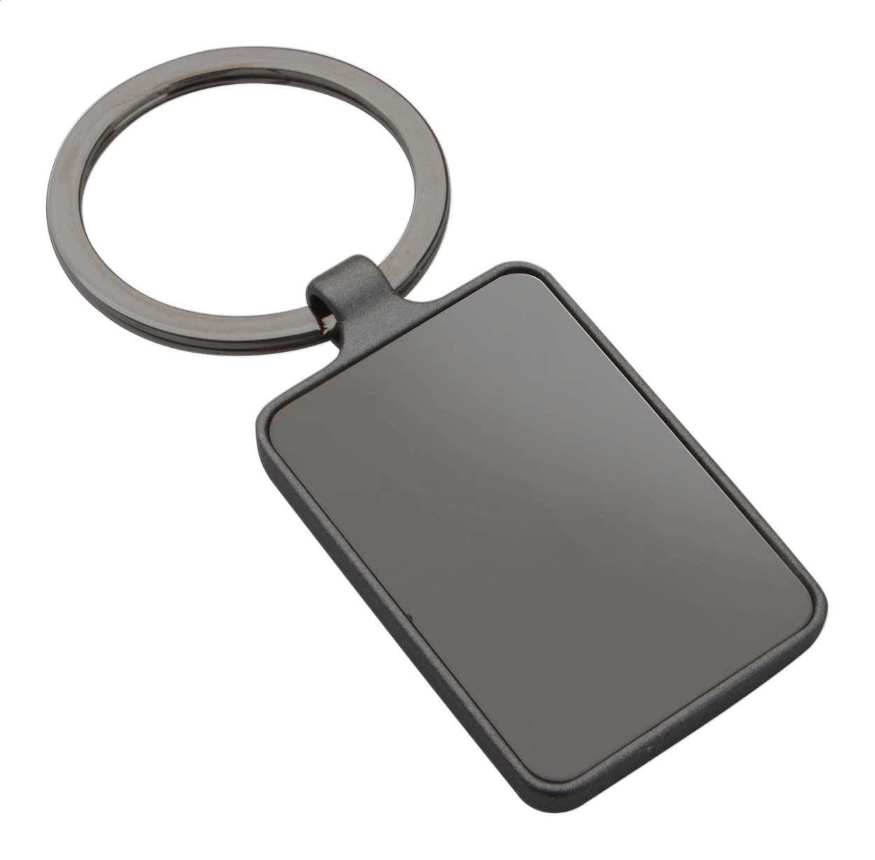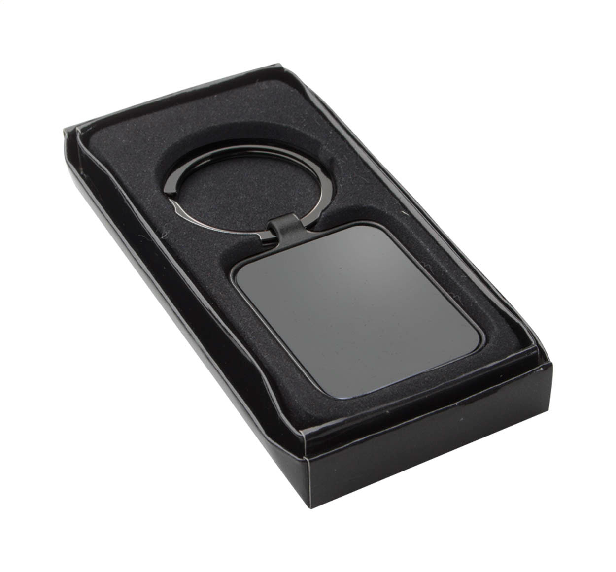 Portachiavi rettangolare in metallo con finitura canna di fucile e piastra lucida su entrambi i lati. Fornito in elegante confezione di cartoncino nero.