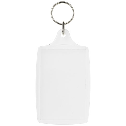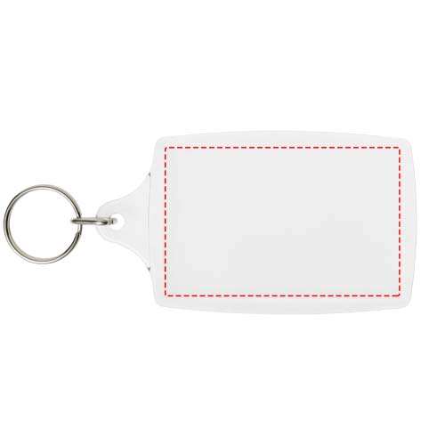 Portachiavi L4 trasparente con anello in metallo diviso. L'anello di metallo a loop ha un profilo piatto ideale per le spedizioni. Dimensioni dell'inserto stampato: 7 cm x 4,5 cm.