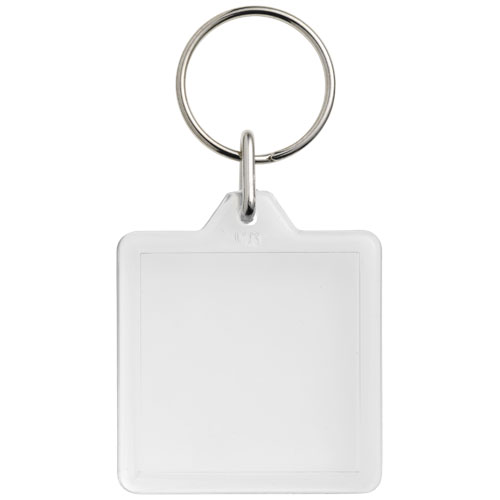Portachiavi U1 quadrato trasparente, con anello in metallo diviso. L'anello di metallo a loop ha un profilo piatto ideale per le spedizioni. Dimensioni dell'inserto stampato: 3,2 cm x 3,2 cm.